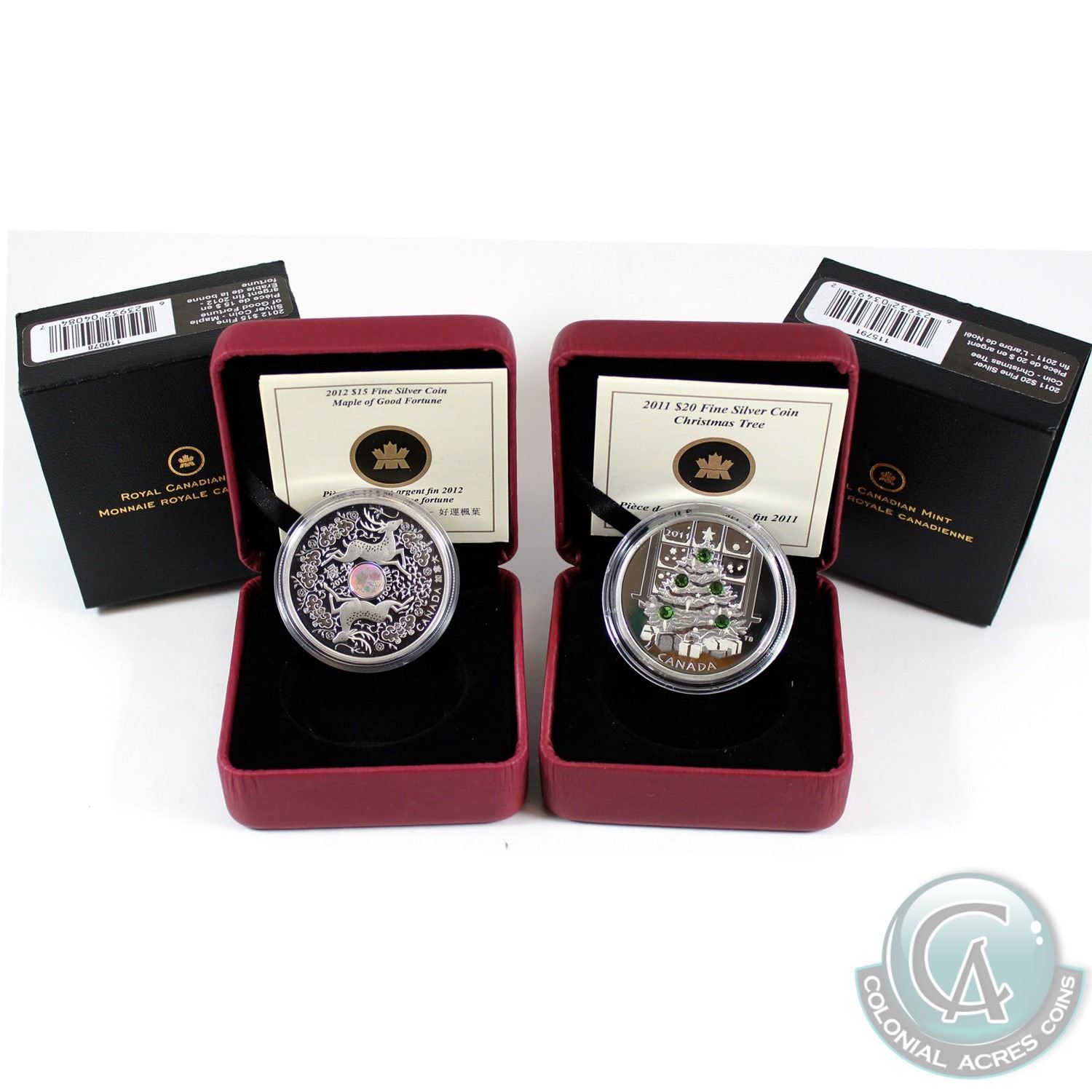 2011 Canada $20 Christmas Tree Fine Silver Coin (outer packaging is scuffed) & 2012 Canada $15 Maple Hologram - Maple of Good Fortune Fine Silver (Tax Exempt). 2pcs
