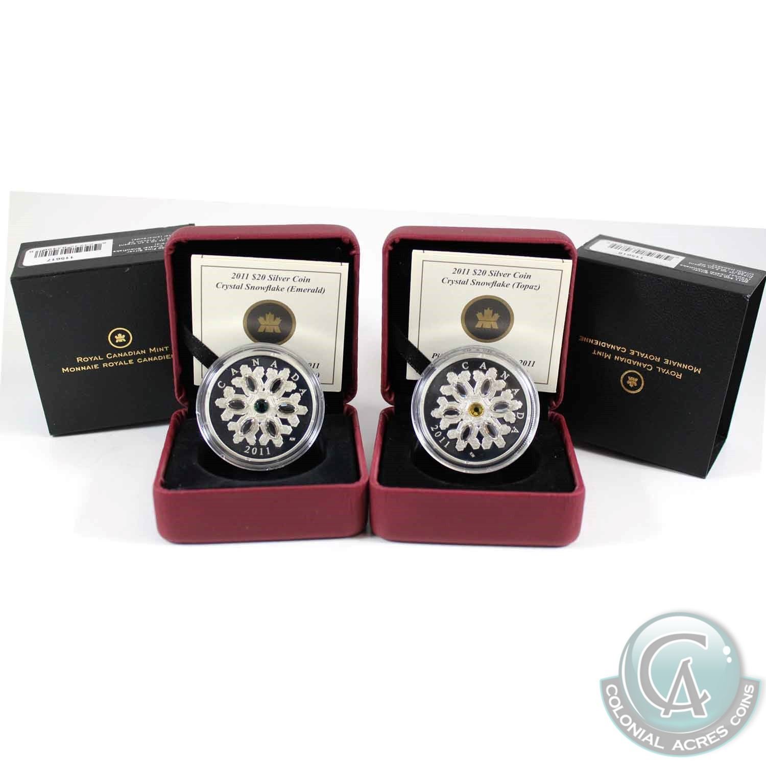 2011 Canada $20 Emerald & Topaz Crystal Snowflake Fine Silver Coins. 2pcs (TAX Exempt)