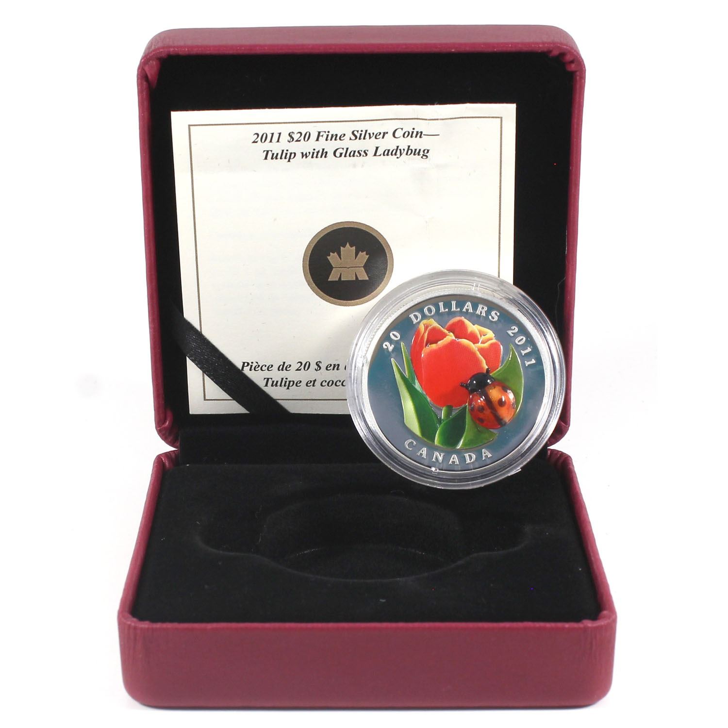 2011 Canada $20 Tulip with Venetian Glass Ladybug Fine Silver Coin (missing outer sleeve & COA lightly bent). TAX Exempt