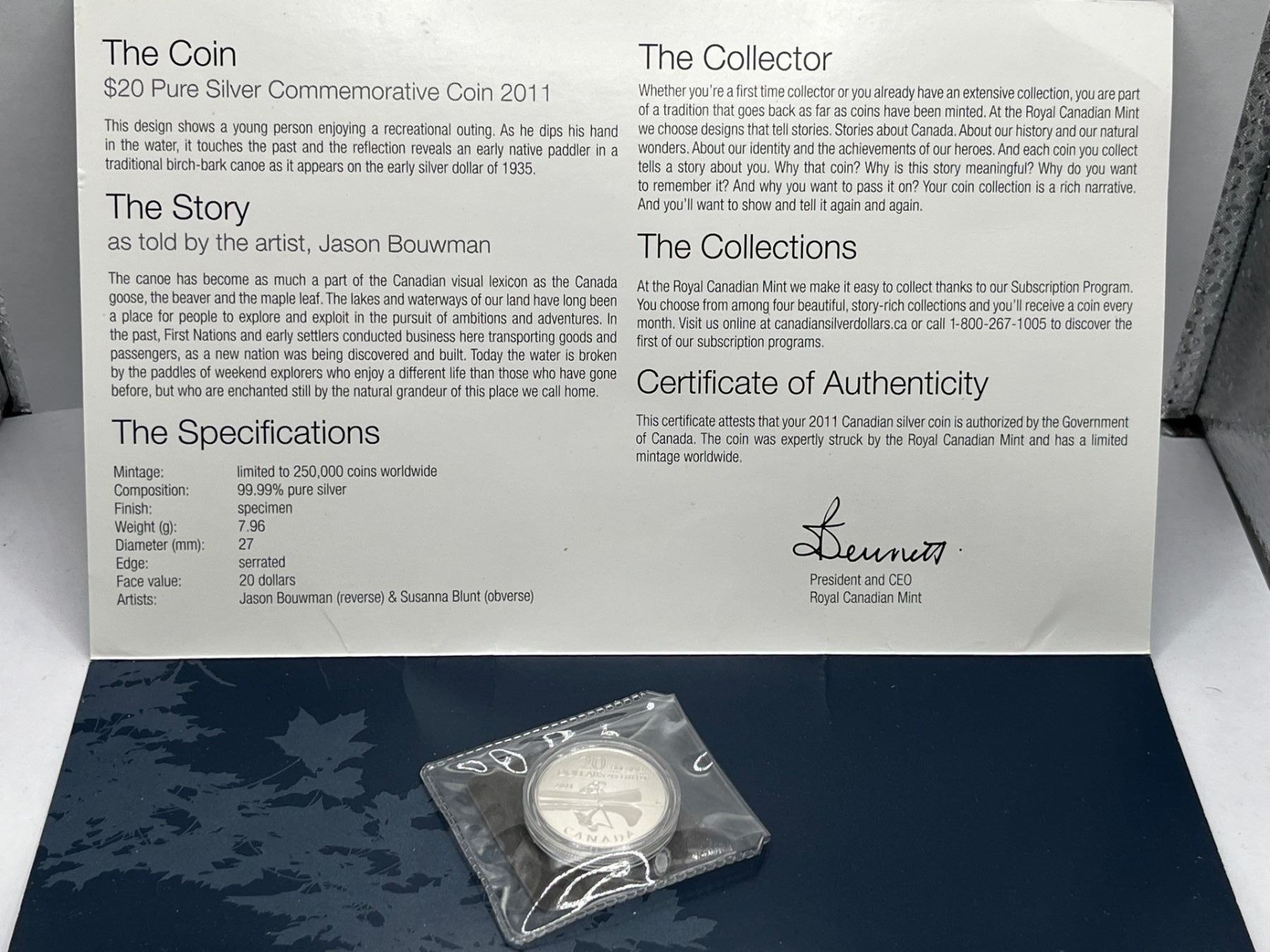 2011 Canadian $20 Commemorative Canoe Coin 7.96g 99.99% Silver