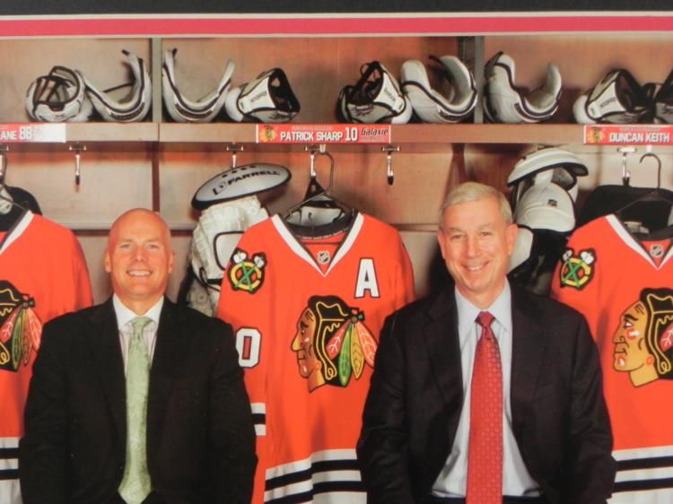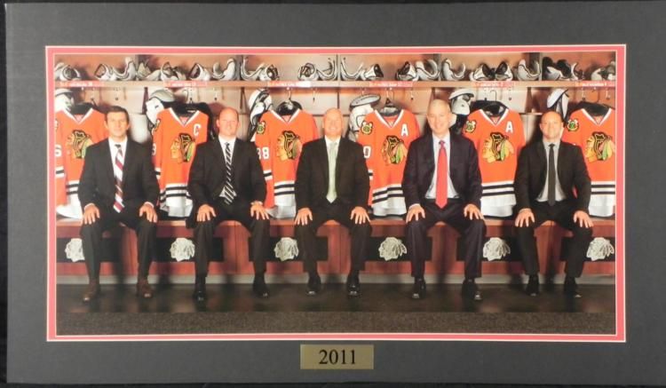 This photo print is a portrait of five key members of the 2011 Chicago Blackhawks Management. They include: John F. McDonough, Jay Blunk, Stan Bowman, Al MacIsaac, and Norm Maciver are shown in the locker room next to jerseys of six of the top Hawks players, including Toews and Kane. This print was only offered through the Blackhawks organization, and was never available to the public, so this is a great find for a collector! Presentation: Double matted in Hawks black and red Matte size: 22 1/2 x 11 1/2 inches Condition: Excellent