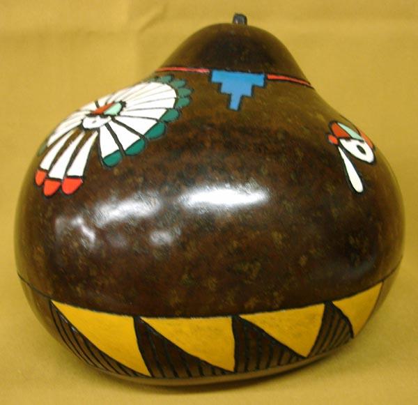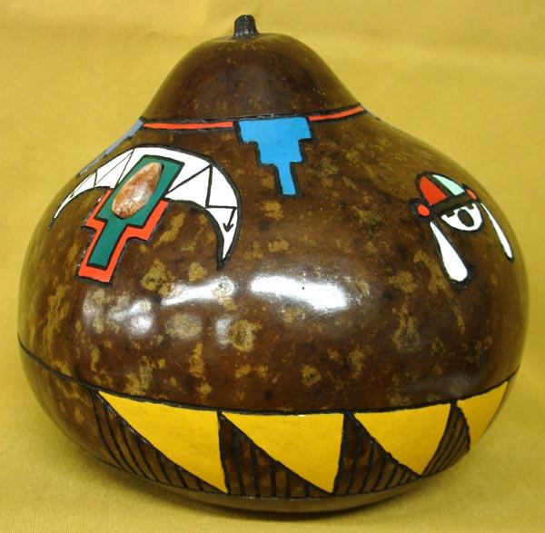 2011 Decorated Gourd With Zuni Design by Silver City, NM artist Frank Anderson. Measures 7.5''hx7.5''w. Signed on bottom.