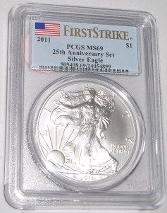 2011 *FIRSTSTRIKE-25TH ANNIVERSARY SET* CERTIFIED BY PCGS MS-69 SILVER EAGLE SERIAL #509408.69/24054899!! SILVER EAGLE CAME OUT OF SAFE!! ***Coin, Currency & All Items Listed in this auction - Grades, Conditions and Values are not Safe Deposit Coins LLC Responsibilty. Grades, Condition and Values are determined by Consigner(s) & Buyers ONLY