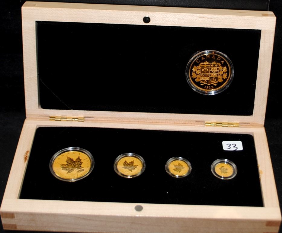 2011 ROYAL CANADIAN MINT FOUR PIECE 99.99 GOLD MAPLE LEAF COIN SET WITH 99.99 FINE SILVER GOLD PLATED MEDALLION IN ORIGINAL COVER & CASE WITH CERTIFICATE OF AUTHENTICITY