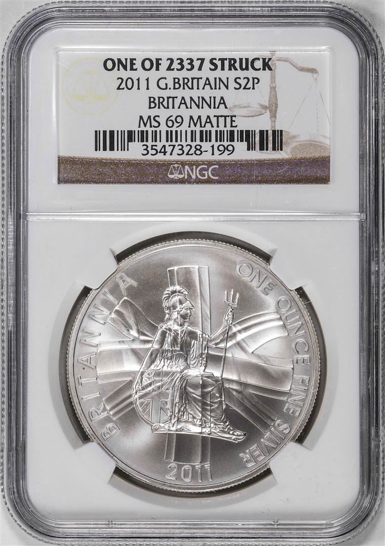 One 2011 Great Britain 2 Pounds Britannia Silver Coin NGC MS69 Matte One of 2337 Struck. NGC Certified.