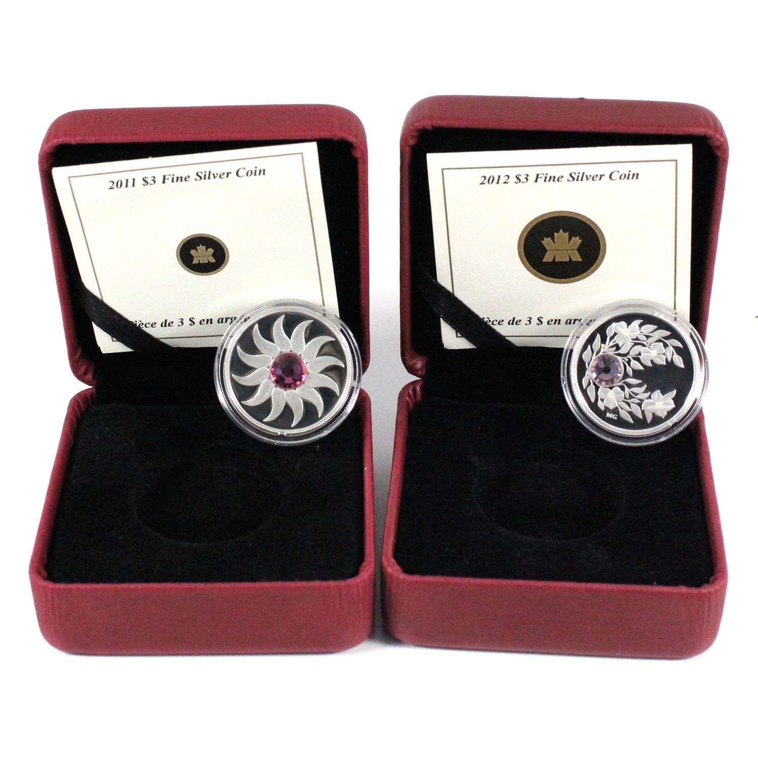 2011 January & 2012 February Canada Fine Silver Birthstone Coins with Swarovski Element (Missing outer sleeves & 2012 capsule is scratched). 2pcs