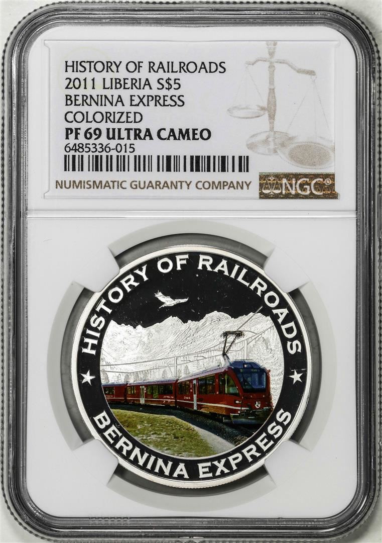 One 2011 Liberia $5 History of Railroads Bernina Express Silver Coin NGC PF69 Ultra Cameo. NGC Certified.