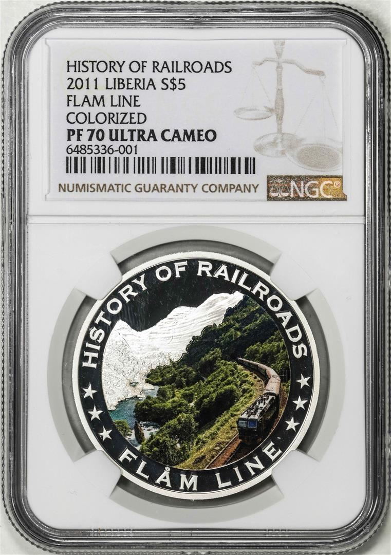 One 2011 Liberia $5 History of Railroads Flam Line Silver Coin NGC PF70 Ultra Cameo. NGC Certified.