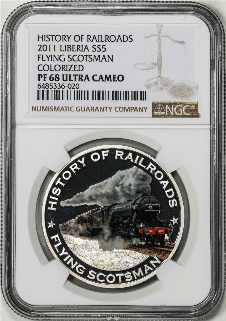 One 2011 Liberia $5 History of Railroads Flying Scotsman Silver Coin NGC PF68 Ultra Cameo. NGC Certified.