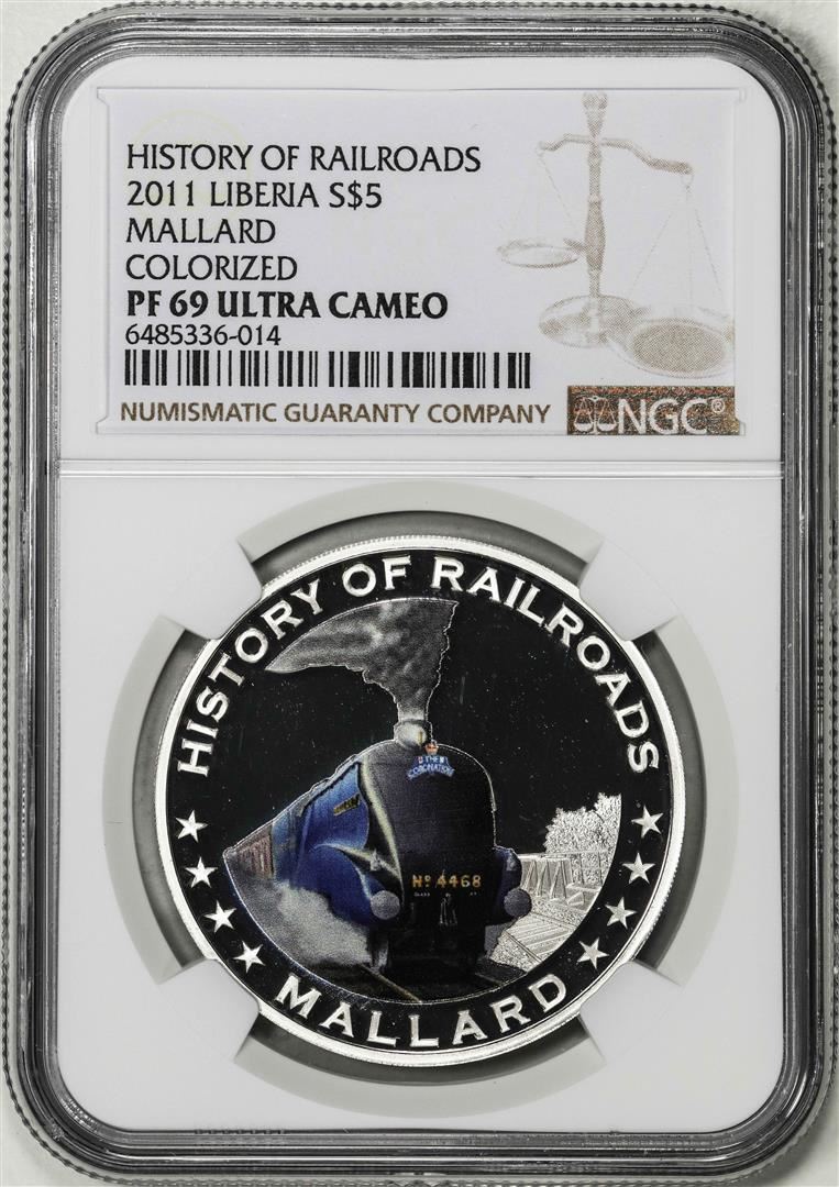 One 2011 Liberia $5 History of Railroads Mallard Proof Silver Coin NGC PF69 Ultra Cameo. NGC Certified.