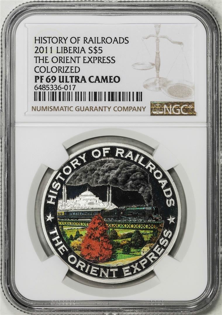 One 2011 Liberia $5 History of Railroads Orient Express Silver Coin NGC PF69 Ultra Cameo. NGC Certified.