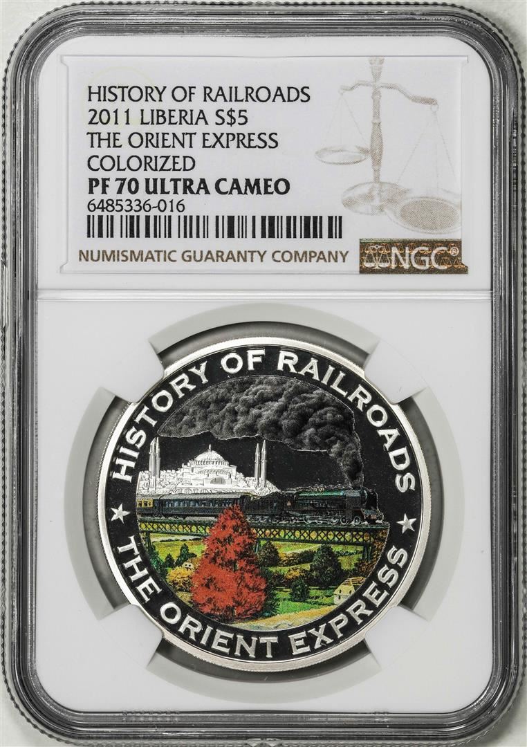 One 2011 Liberia $5 History of Railroads Orient Express Silver Coin NGC PF70 Ultra Cameo. NGC Certified.