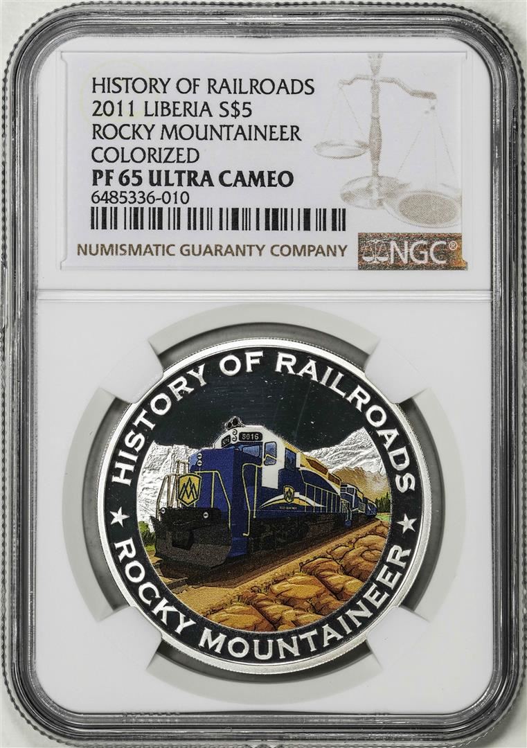 One 2011 Liberia $5 History of Railroads Rocky Mountaineer Coin NGC PF65 Ultra Cameo. NGC Certified.