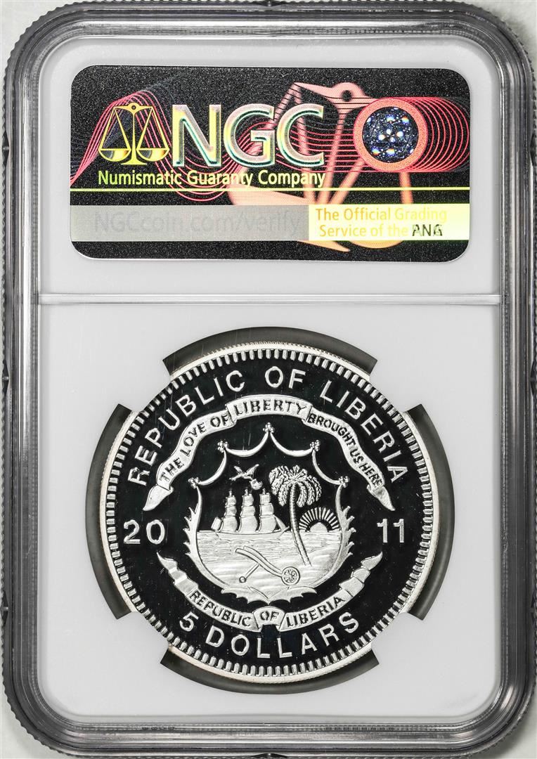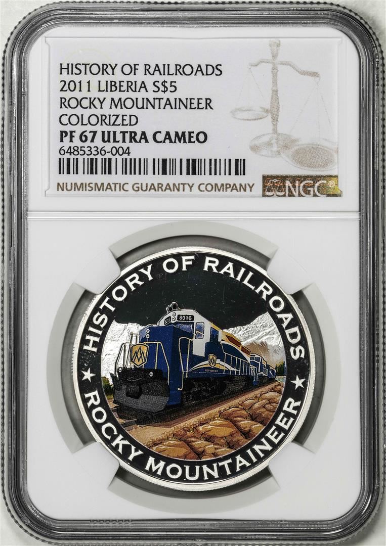 One 2011 Liberia $5 History of Railroads Rocky Mountaineer Coin NGC PF67 Ultra Cameo. NGC Certified.