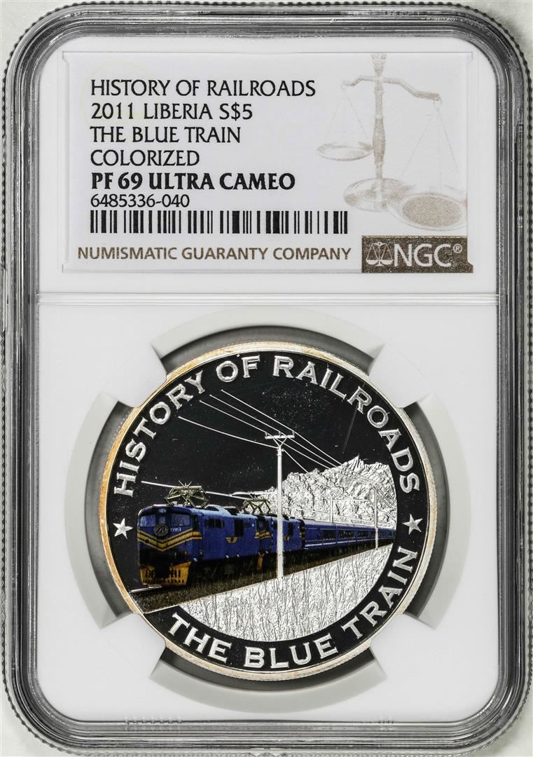 One 2011 Liberia $5 History of Railroads The Blue Train Silver Coin NGC PF69 Ultra Cameo. NGC Certified.