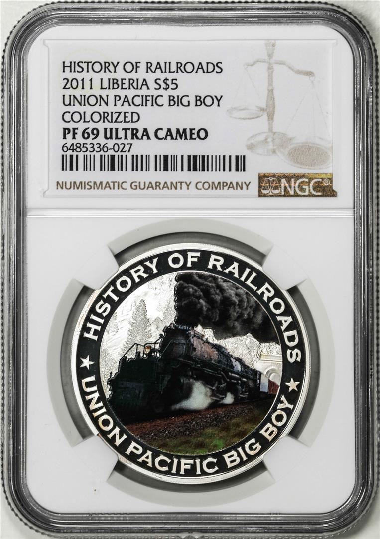 One 2011 Liberia $5 History of Railroads Union Pacific Big Boy Coin NGC PF69 Ultra Cameo. NGC Certified.