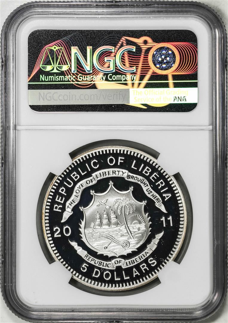 One 2011 Liberia $5 Proof China Railways Typsy History Silver Coin NGC PF67 Ultra Cameo. NGC Certified.