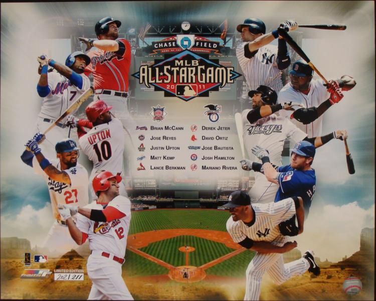 The MLB All-Star game, where you the fans can choose who plays. In 2010, the biggest stars journeyed out to the desert to Chase Field in Phoenix Arizona. This is a 16x20" photographic collage of the some of the headline players who competed. Such names are Jose Reyes, Brain McCann, David Ortiz, Josh Hamilton, and more. Each player is in there batting stance (except Mariano Rivera who is closing out another game), with the field in between them. The photograph is of a limited edition, 202/211, has a MLB hologram at the bottom right, and is in mint condition.