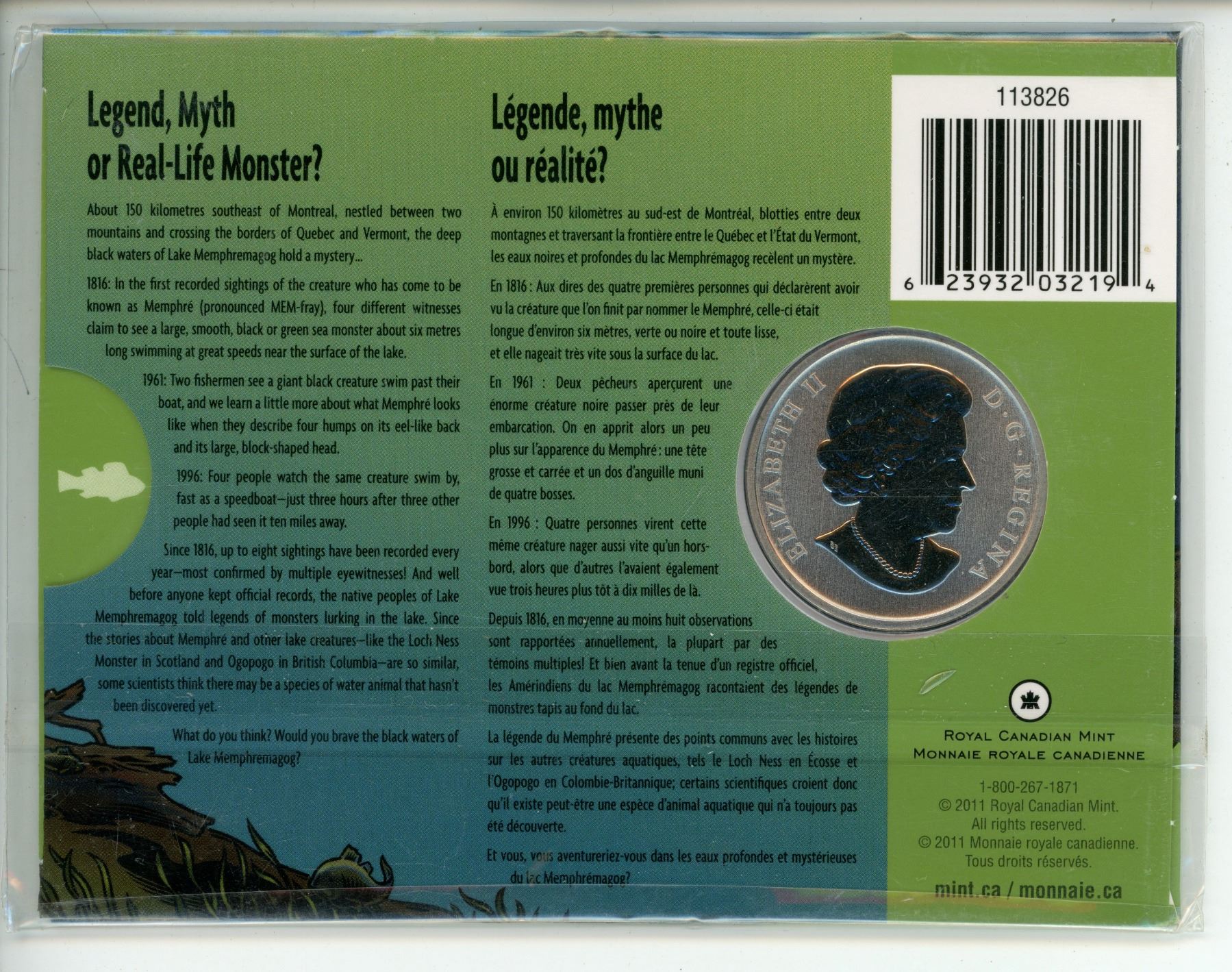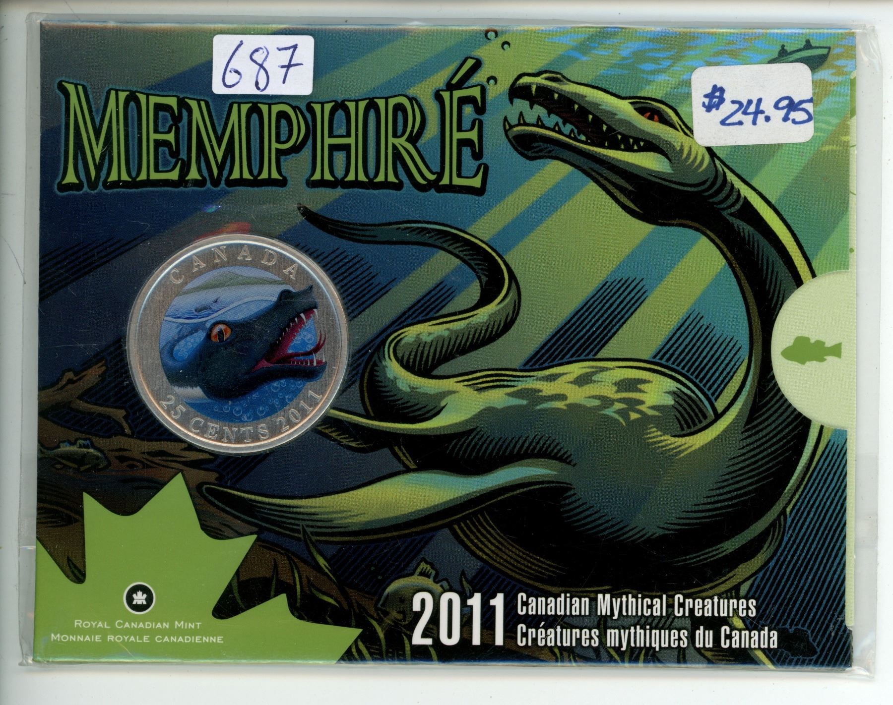2011 Memphre 25 Cents. Colourized mythical creature. Only 5,811 Sold. Specimen. Housed in its unopened Royal Canadian Mint folder.