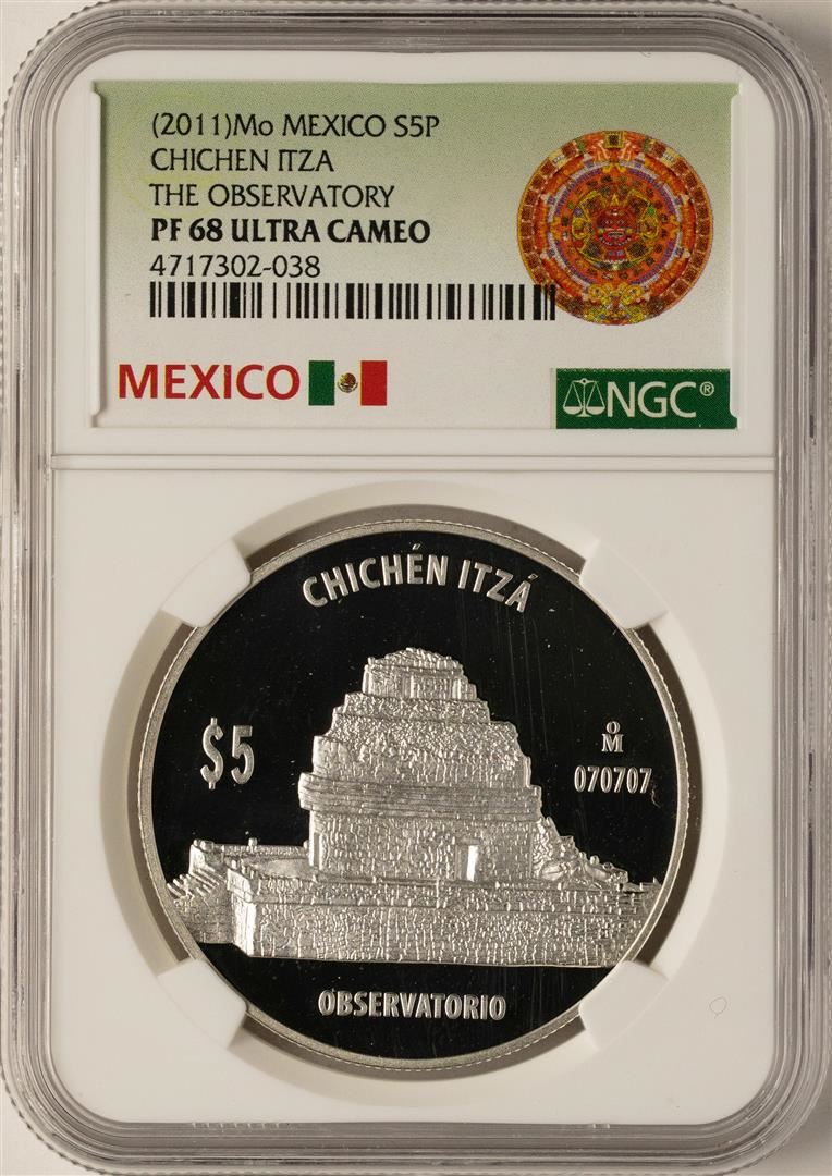 One 2011 Mexico 5 Pesos Chichen Itza Commemorative Silver Coin NGC PF68 Ultra Cameo. NGC Certified.