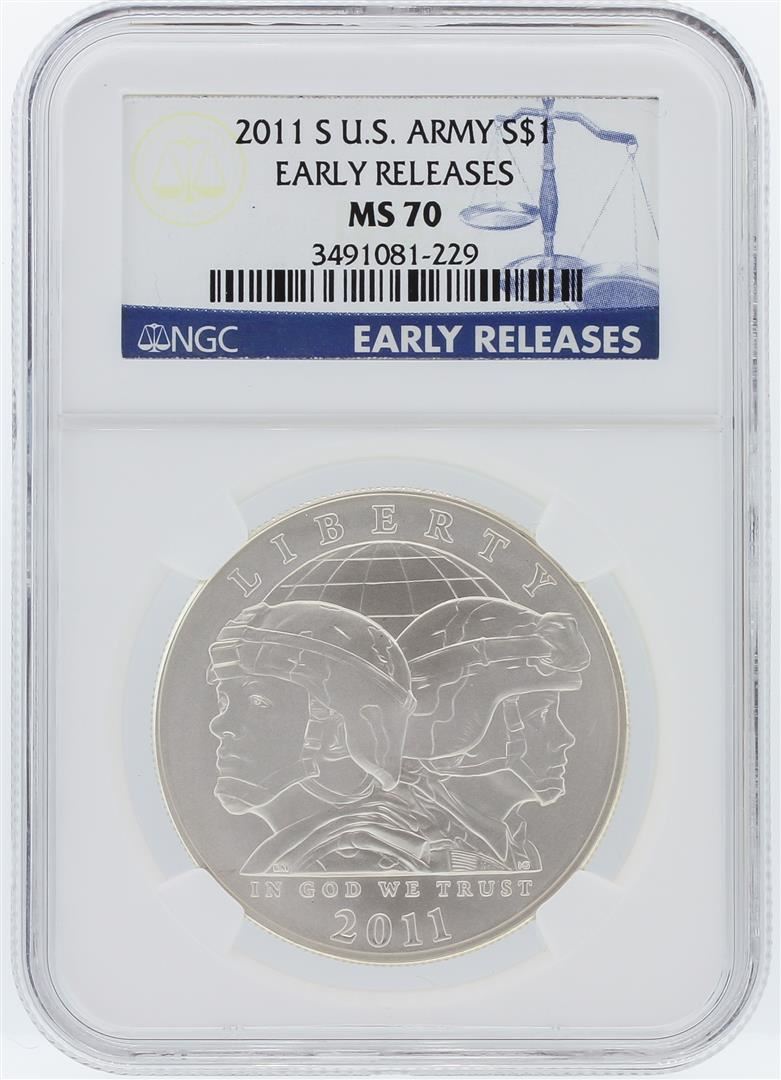 One 2011 NGC MS70 Early Release U.S. Army Commemorative Silver Dollar. NGC Certified.