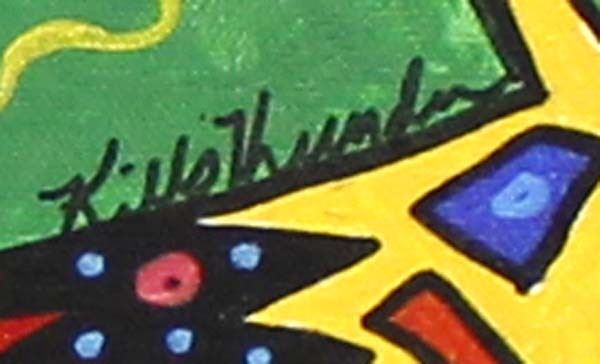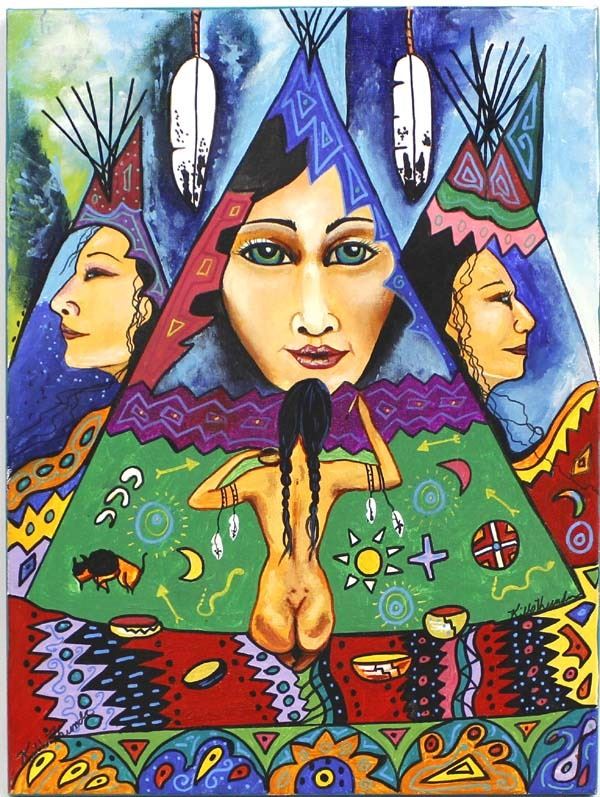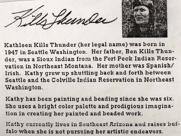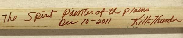 2011 Original Acrylic Painting ''The Spirit Painting of the Plains'' by Kills Thunder, measures 18'' x 24'' and is signed by the artist, Artist Bio: Kathleen Kills Thunder (her legal name) was born in 1947 in Seattle, WA. Her father, Ben Kills Thunder, was a Sioux Indian from the Fort Peck Indian Reservation in NE Montana. Her mother was Spanish/Irish. Kathy grew up shuttling back and forth between Seattle and the Colville Indian Reservation in NE Washington. Kathy has been painting and beading since she was six. She uses a bright color palette and prodigious imagination in creating her painted and beaded work. Kathy currently lives in SE Arizona and raises buffalo when she is not pursuing her artistic endeavors.
