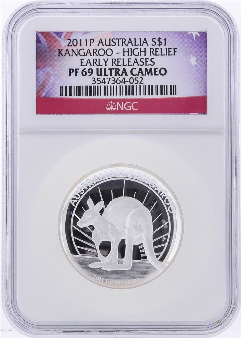 One 2011-P $1 Australia Kangaroo High Relief Early Release NGC PF69 Ultra Cameo. NGC Certified.