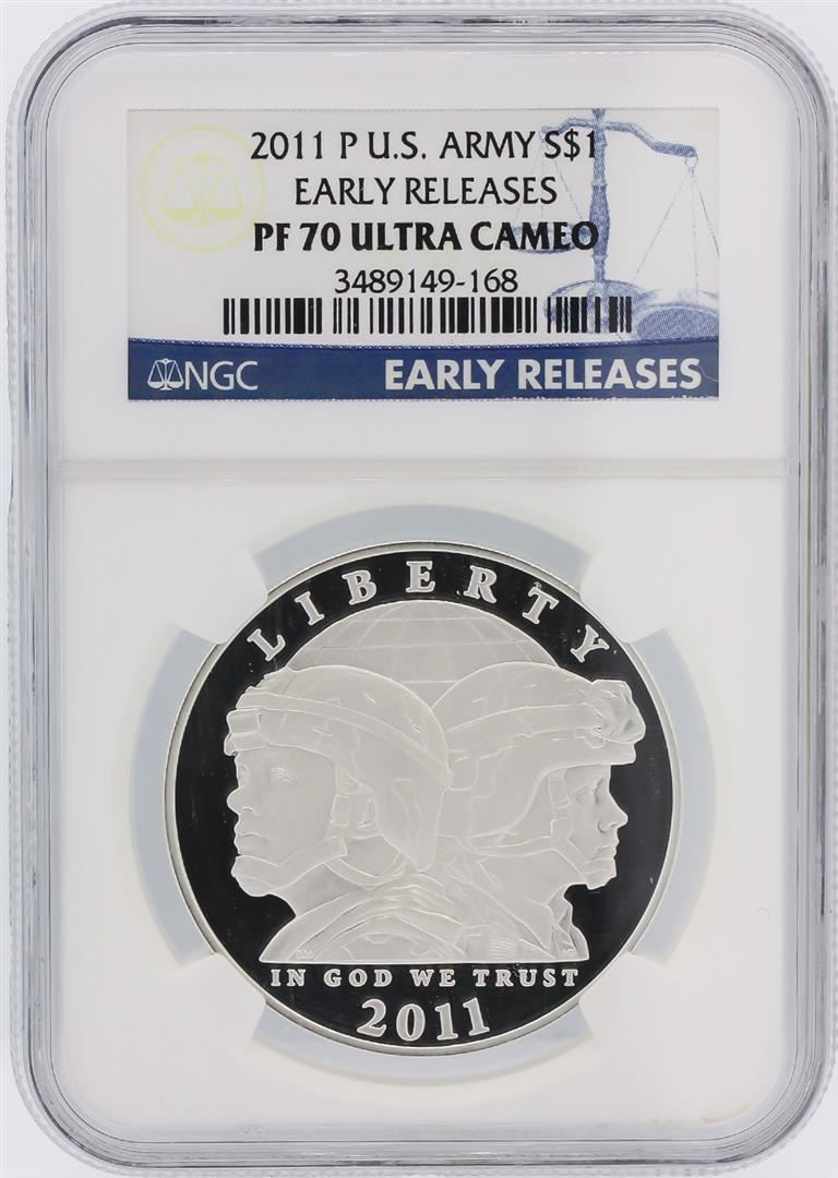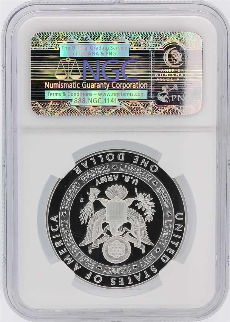 One 2011-P NGC Graded PF70 Ultra Cameo $1 U.S. Army Silver Coin. NGC Certified.
