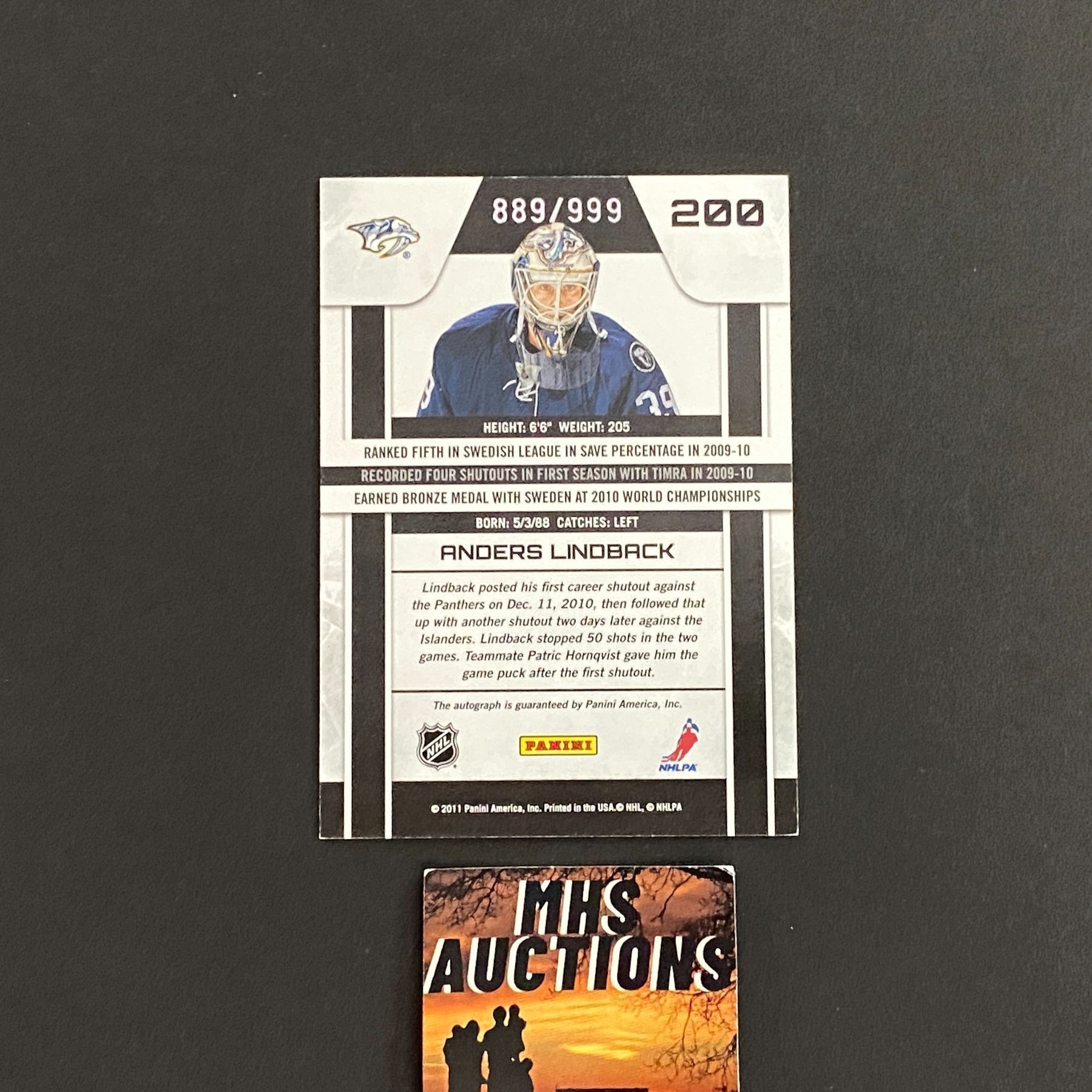 2011 PANINI ANDERS LINDBACK AUTOGRAPH HOCKEY CARD #889/999 ONLY 999 MADE