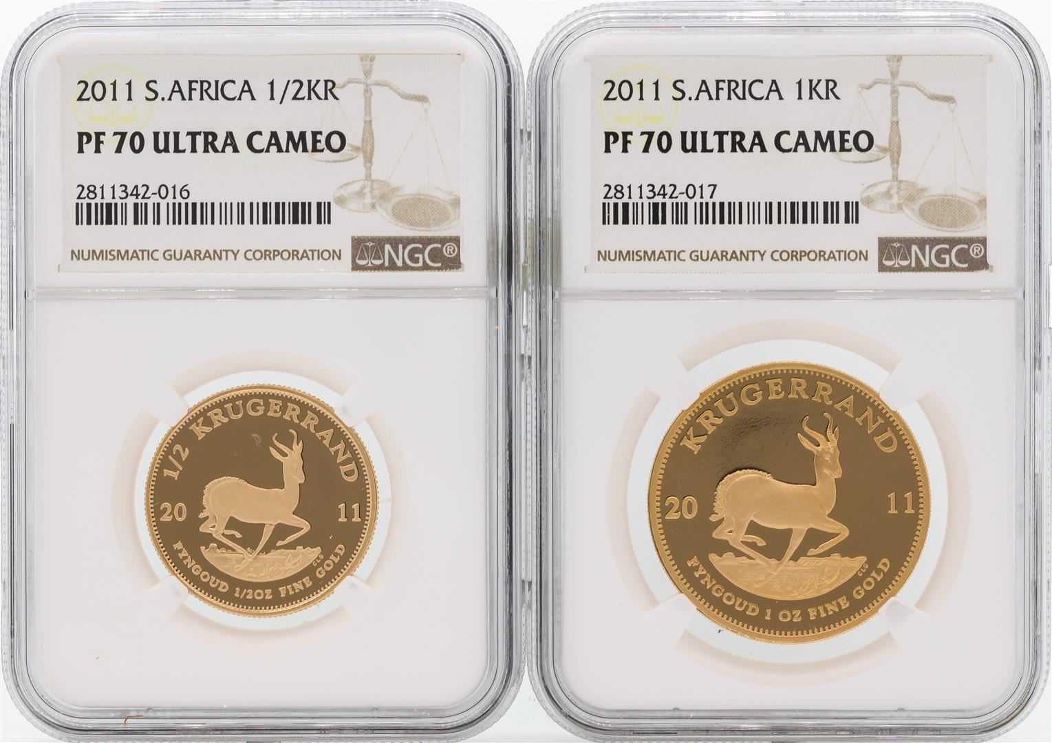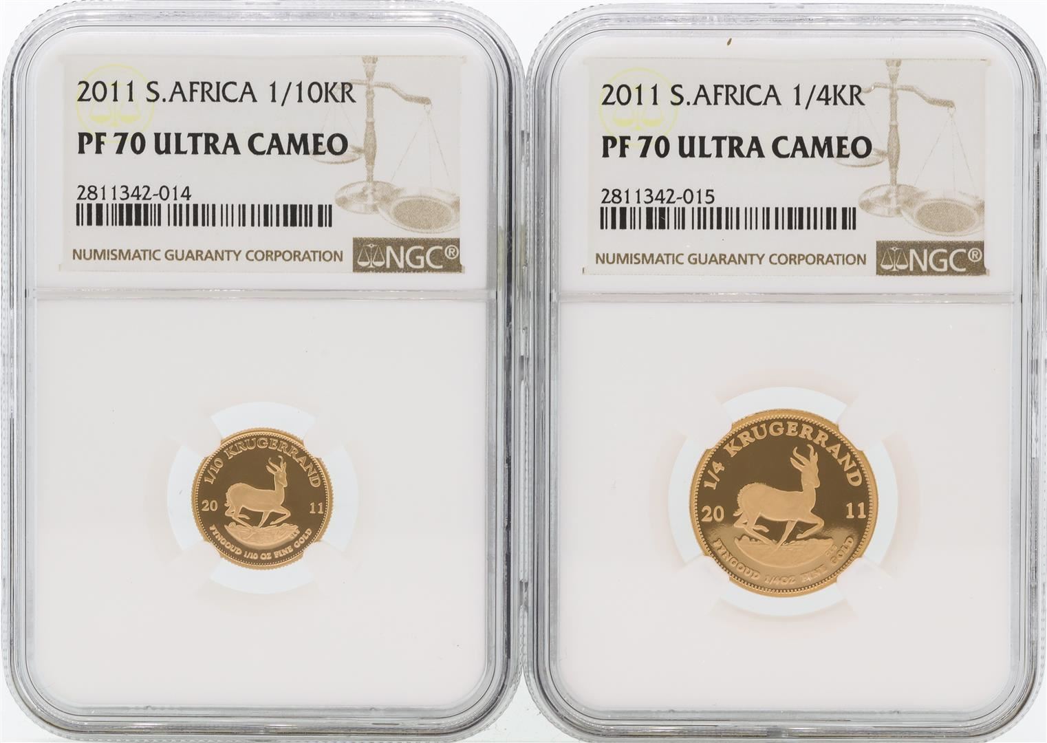 One 2011 PF70 Ultra Cameo Krugerrand 4 Coin Proof Set, featuring one 1/10KR coin, one 1/4KR coin, one 1/2KR coin and one 1KR coin. NGC Certified.