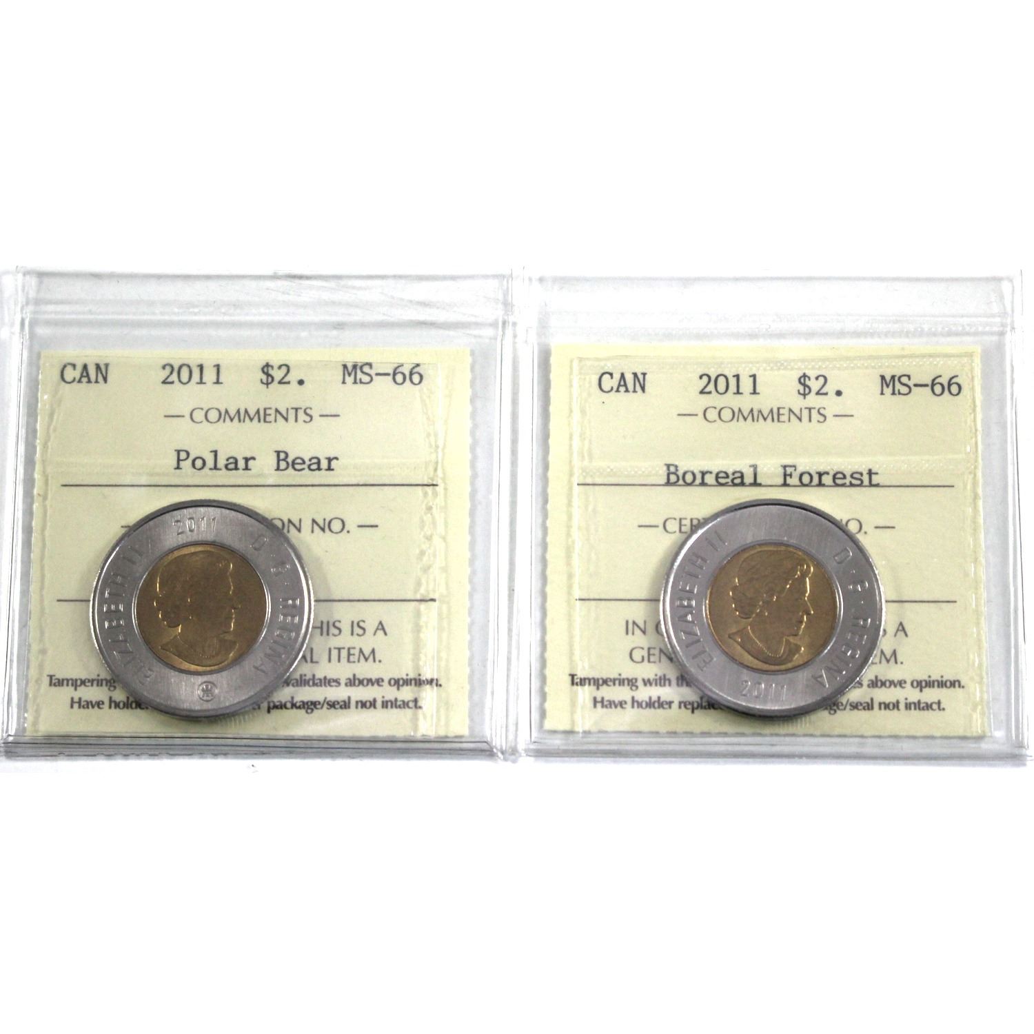 2011 Polar Bear & 2011 Boreal Forest Two Dollar ICCS Certified MS-66. 2pcs