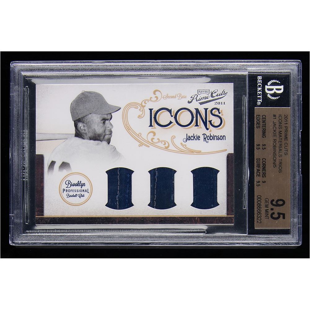 Graded by BGS GEM MINT 9.5. Historic game-worn relic card of barrier-breaking Brooklyn Dodgers infielder Jackie Robinson, numbered 2/5, featuring three nice game-used navy blue patch swatches.