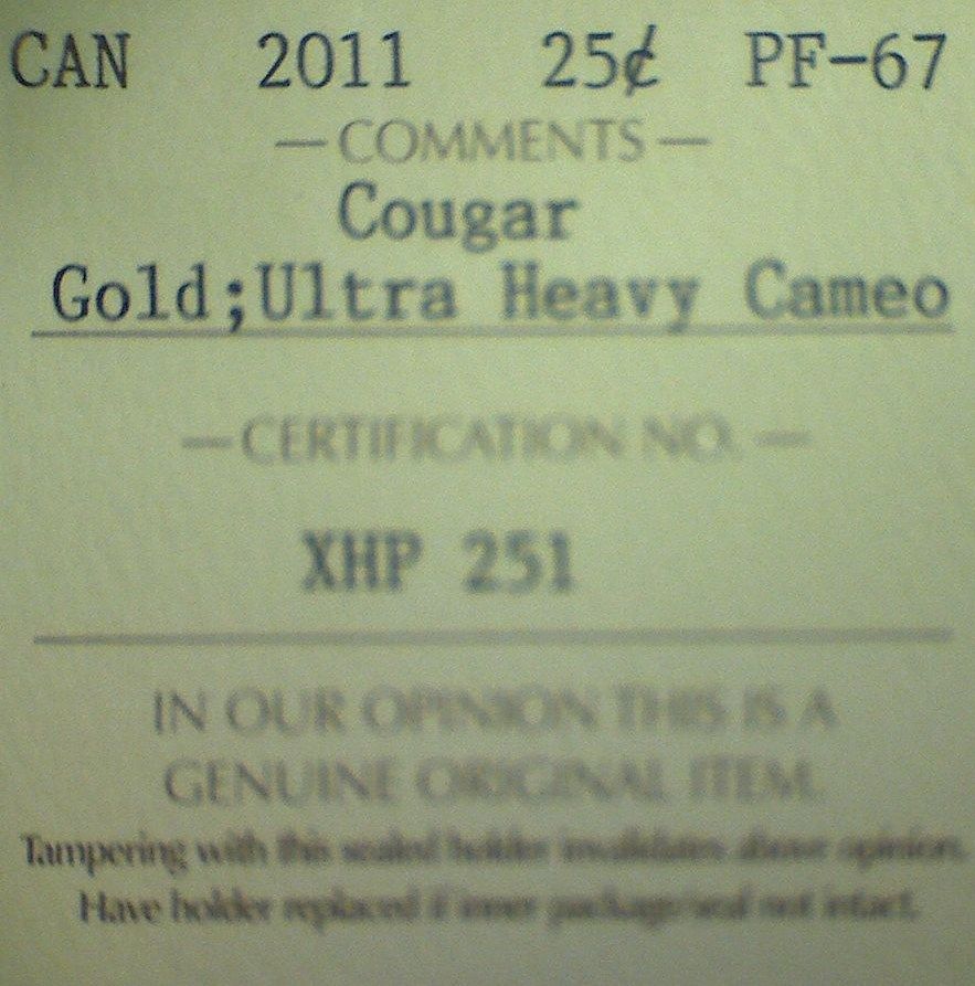 2011 - R.C.M. - 25 Cents - Cougar - .5 gram of .9999 gold - ICCS - PF-67 - Gold - Ultra Heavy Cameo