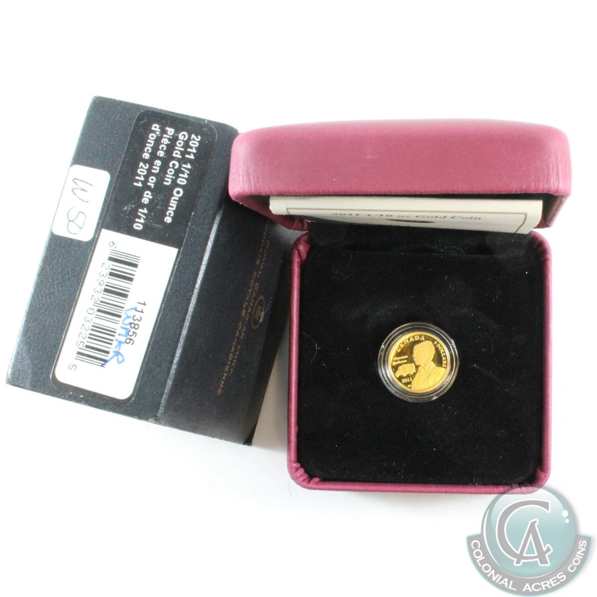 2011 RCM 1/10 oz Gold coin commemorating the 75th Anniversary of Bethune's invention: the World's first Mobile Blood Transfusion vehicle (Tax Exempt). The outer sleeve is lightly tattered and contains writing on it. However, the coin comes with all original Mint packaging and COA.