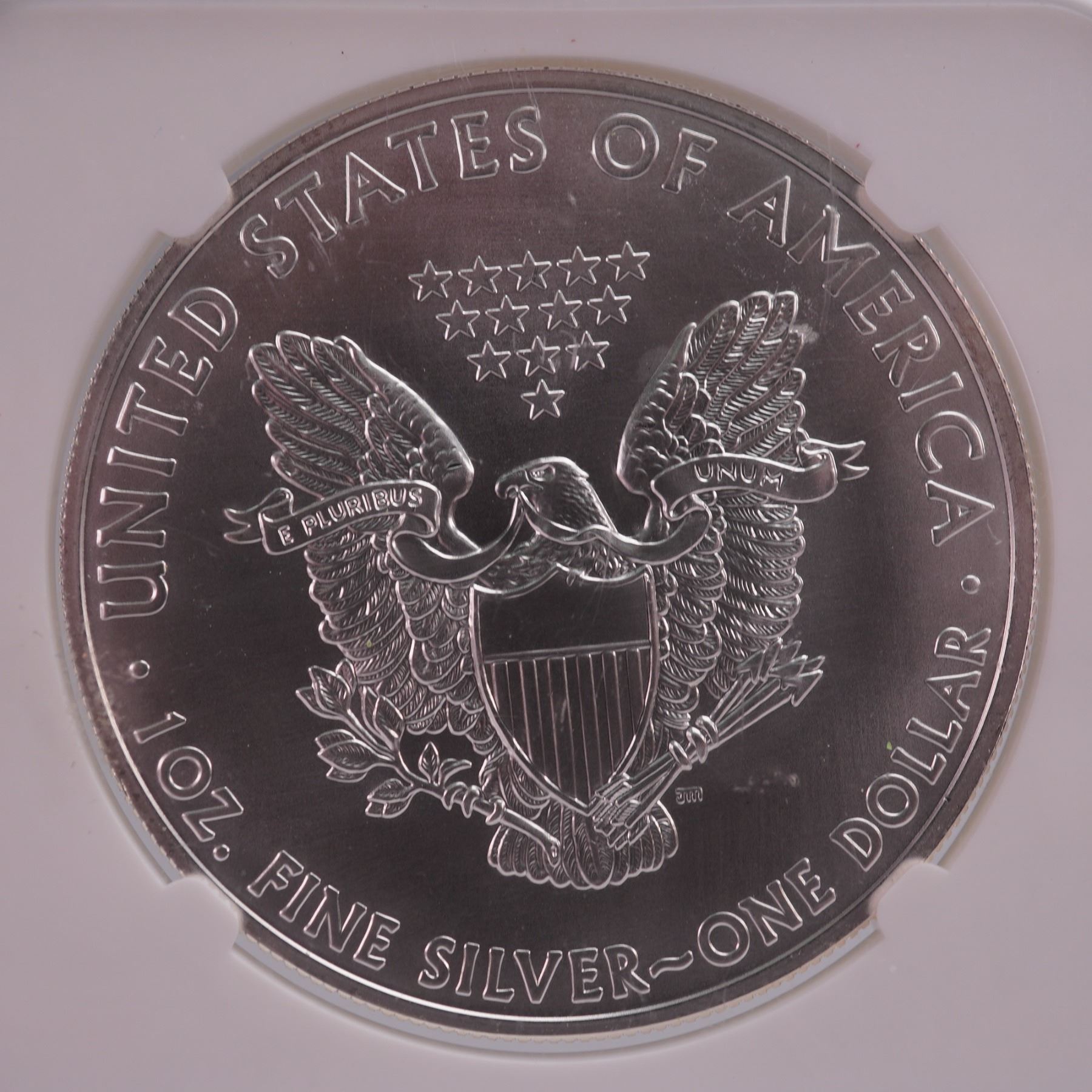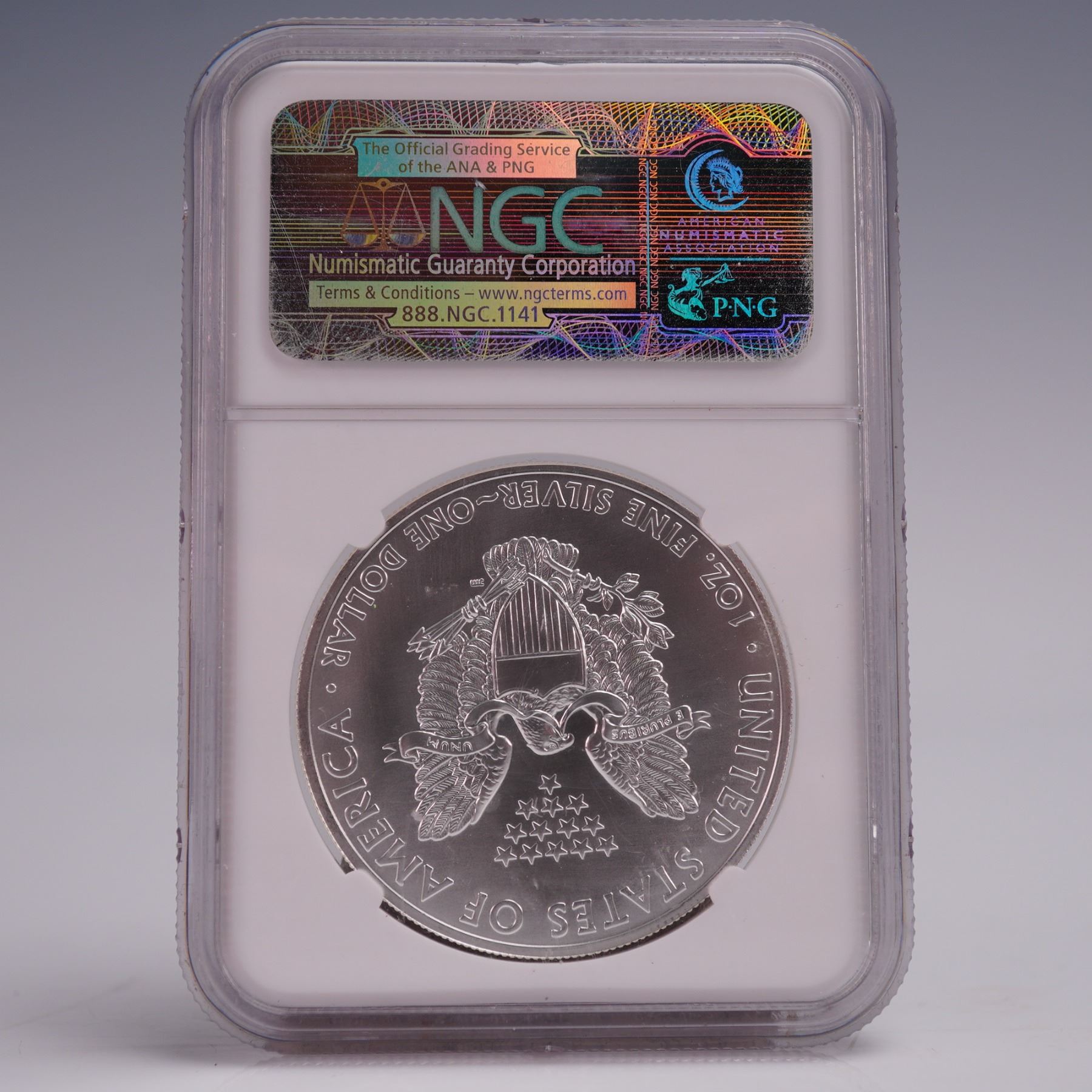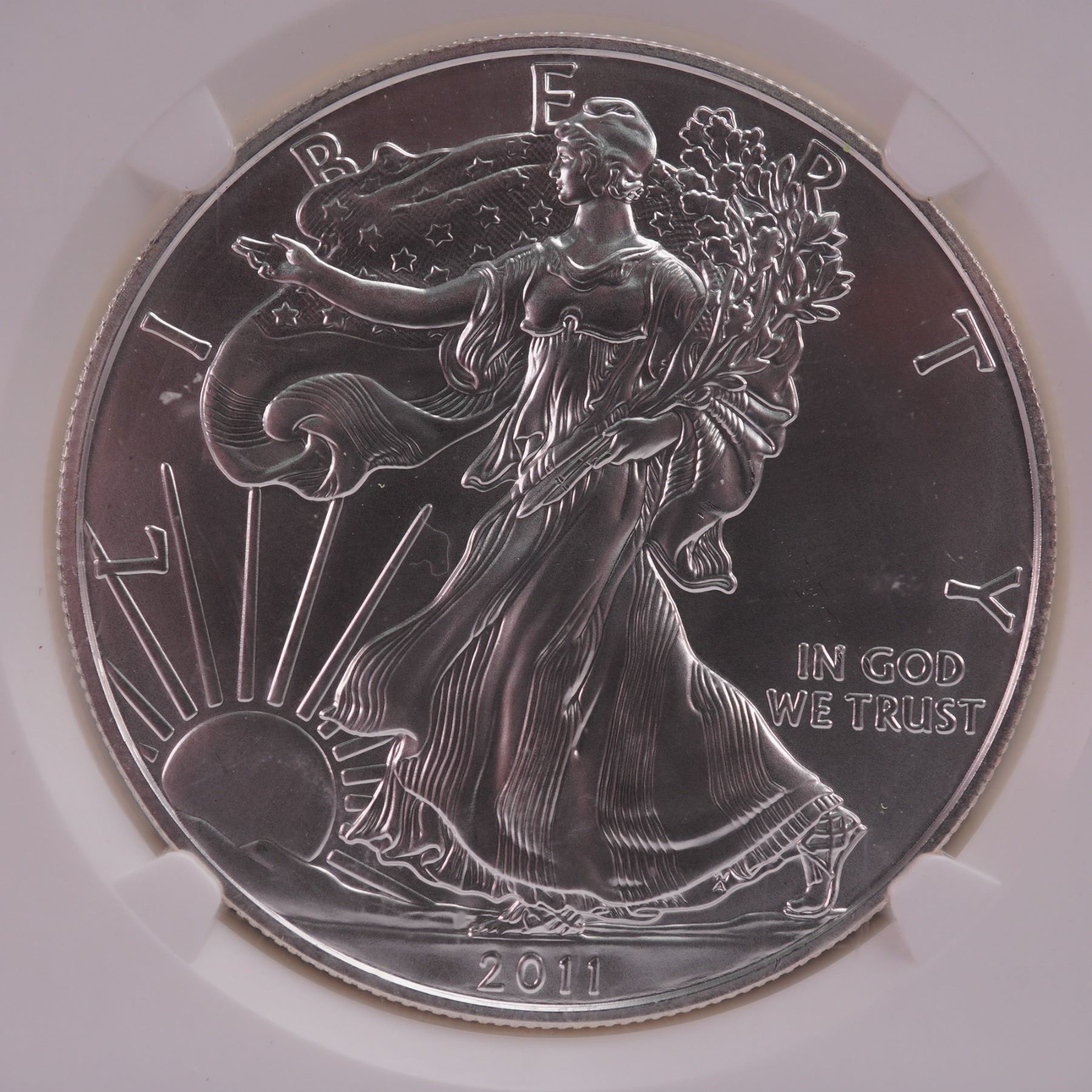 A striking 2011 American Silver Eagle One Dollar coin, certified by the Numismatic Guaranty Corporation (NGC) with a near-flawless Mint State 69 grade under the Early Releases designation. Composed of one troy ounce of .999 fine silver. The obverse showcases Adolph A. Weinman's celebrated "Walking Liberty" motif, originally introduced in 1916, rendered in high relief with delicate detail. Liberty is depicted striding confidently toward a rising sun, her flowing robes billowing around her, right arm extended in peaceful gesture, and her left clutching branches of oak and laurel. The reverse, by John Mercanti, features a powerful heraldic eagle behind a striped shield, wings outspread, clutching arrows and an olive branch, and framed beneath thirteen stars representing the original colonies. The finely reeded edge and crisp strike are characteristic of the San Francisco Mint's exacting standards. Encased in a graded NGC slab for further preservation and authentication. Slab measures: 2.25"L x 0.25"W x 3.25"H. Coin diameter: 40.6 mm.