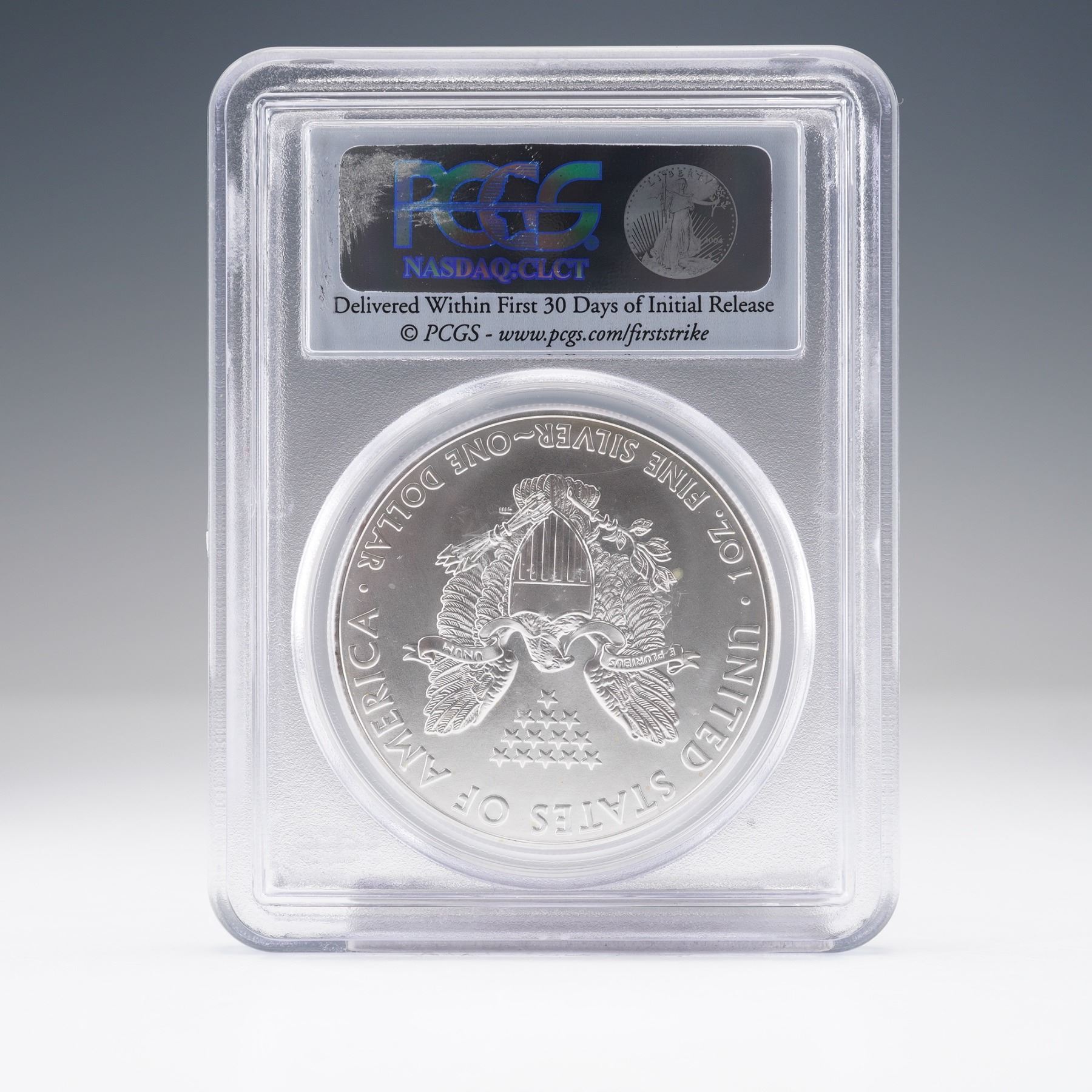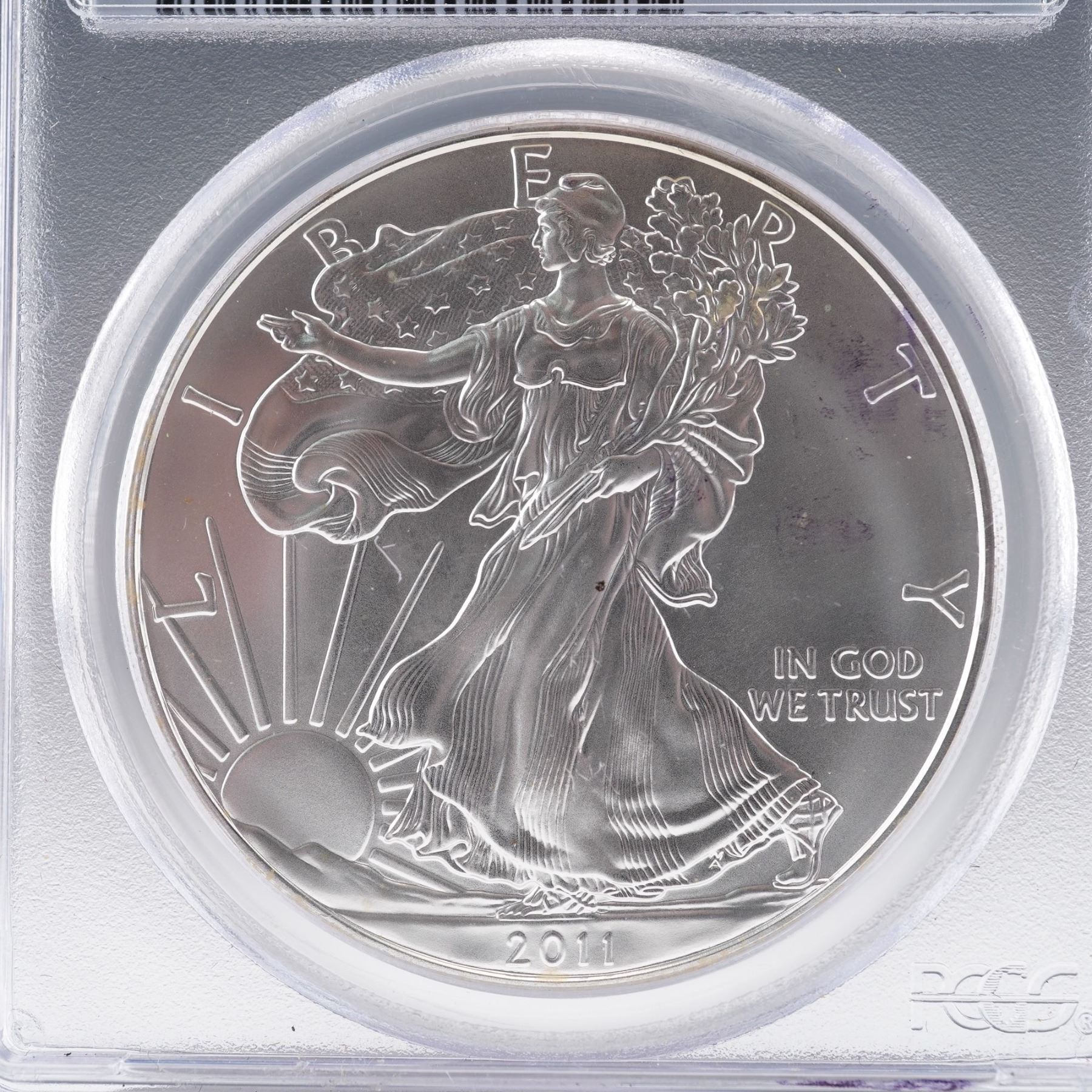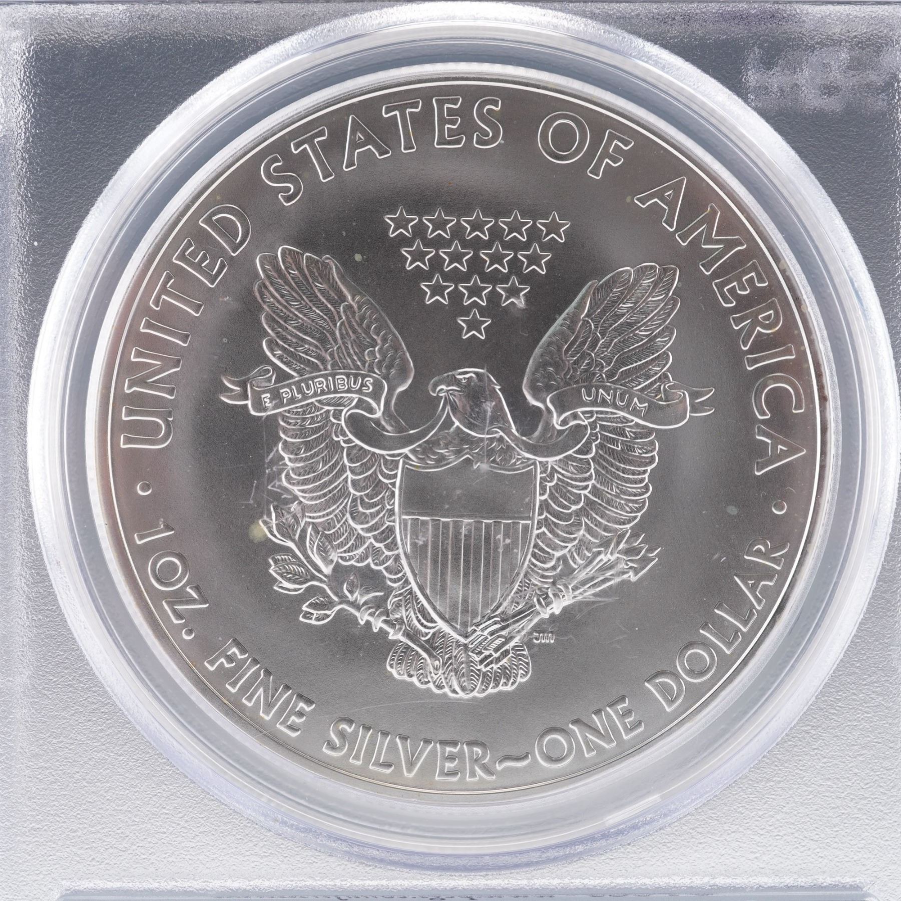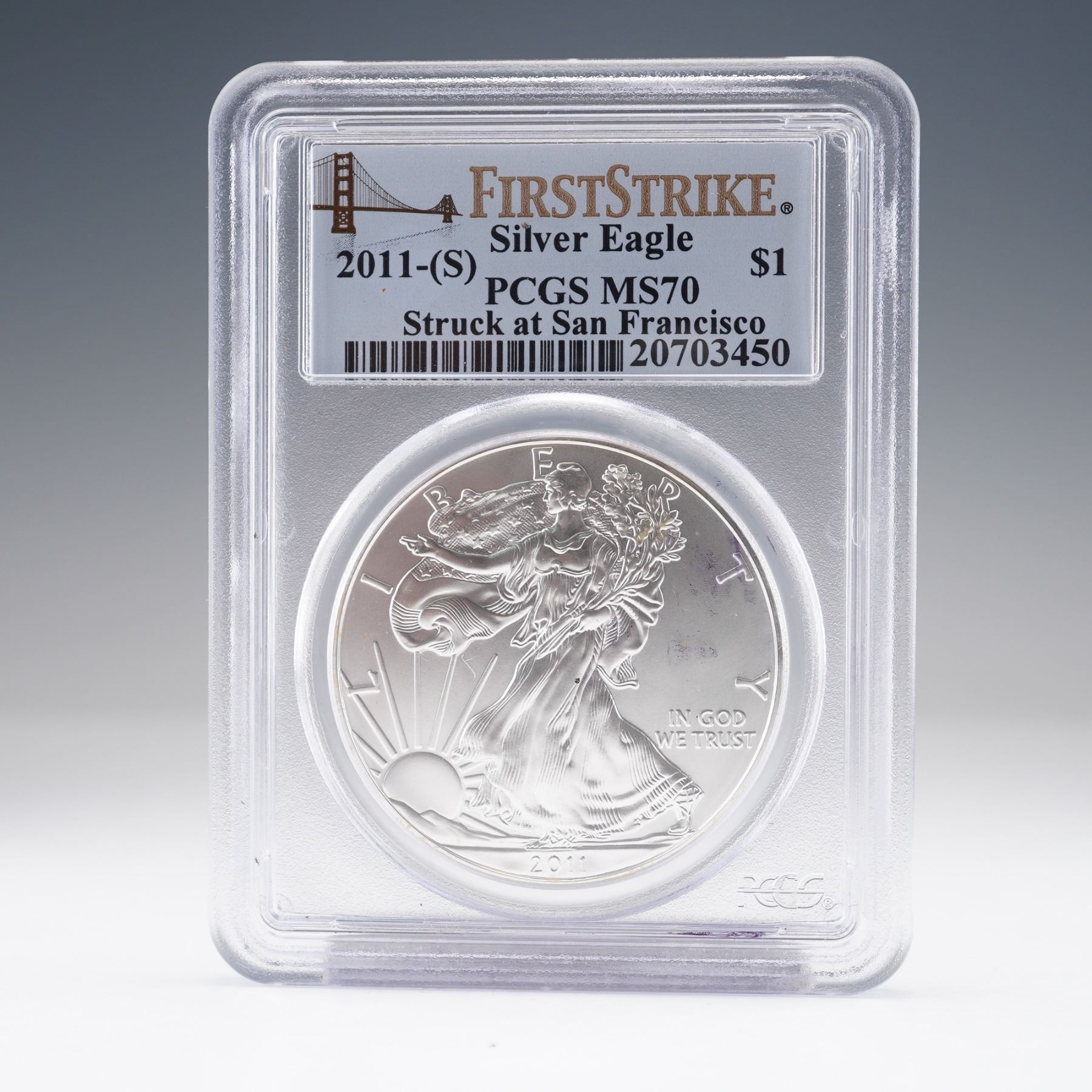 This 2011-(S) American Silver Eagle one-dollar coin, certified by the Professional Coin Grading Service (PCGS) with a perfect grade of MS70. Struck at the San Francisco Mint, this First Strike designation signifies that the coin was delivered within the first 30 days of its initial release. Composed of one troy ounce of fine silver. The obverse features Adolph A. Weinman's iconic Walking Liberty design, radiating a sense of patriotic elegance, and is bordered by the inscriptions LIBERTY, IN GOD WE TRUST, and the year below. The reverse displays John Mercanti's heraldic eagle motif and flanked with UNITED STATES OF AMERICA, 1 oz. FINE SILVER - ONE DOLLAR. Encapsulated and certified by PCGS for authenticity and preservation.