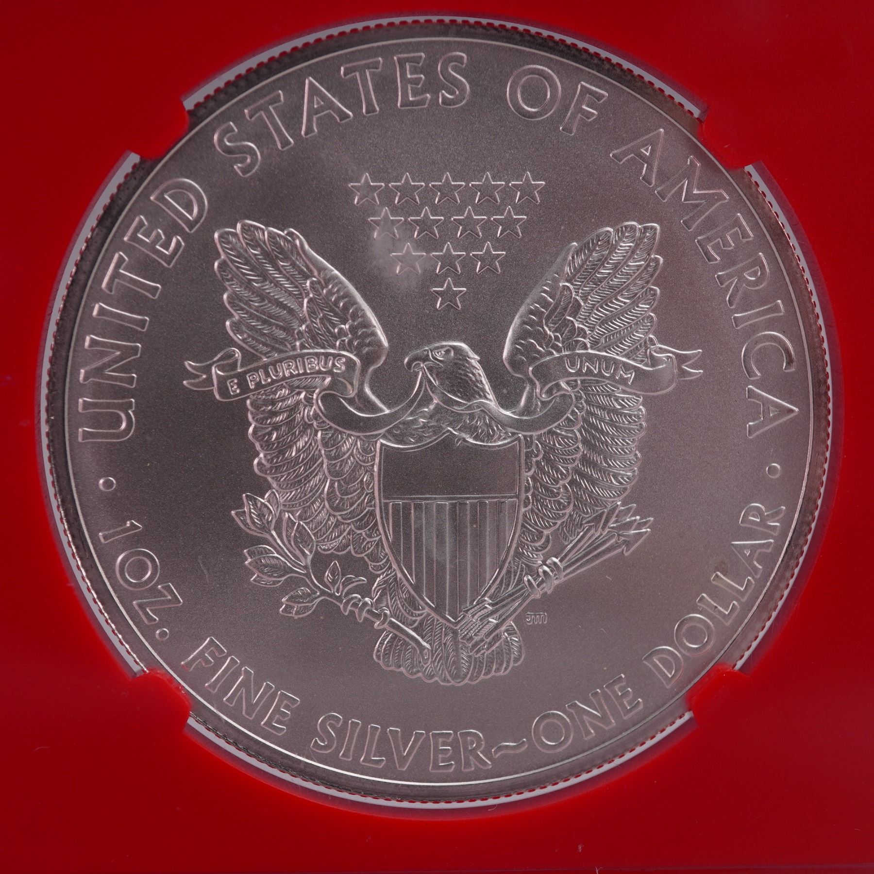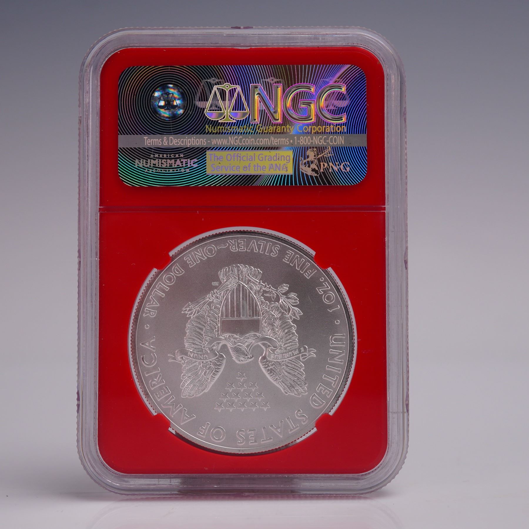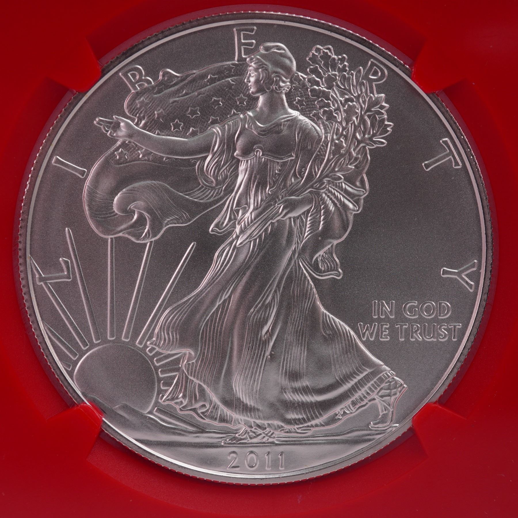 A radiant 2011 American Silver Eagle One Dollar Coin, certified by the Numismatic Guaranty Corporation (NGC) with a high-grade Mint State 69 designation. Struck at the San Francisco Mint and attributed by the "(S)" designation. Struck from one troy ounce of .999 fine silver. he obverse presents the timeless "Walking Liberty" design, wherein Liberty strides forward beneath the rising sun, her robes flowing and the American flag billowing around her. In her left arm, she cradles branches of oak and laurel; emblems of strength and triumph, while her right hand extends outward in a gesture of hope. The inscriptions LIBERTY, IN GOD WE TRUST, and the date. The reverse, by Chief Engraver John Mercanti, features a heraldic eagle with wings spread wide, clutching an olive branch and arrows beneath a triangular array of thirteen stars. The eagle bears a shield across its breast, and a ribbon bearing E PLURIBUS UNUM flows from its beak. Surrounding the design are the inscriptions UNITED STATES OF AMERICA -1 OZ. FINE SILVER - ONE DOLLAR. Encased in a graded NGC slab for further preservation and authentication. Slab measures: 2.25"L x 0.25"W x 3.25"H. Coin diameter: 40.6 mm.