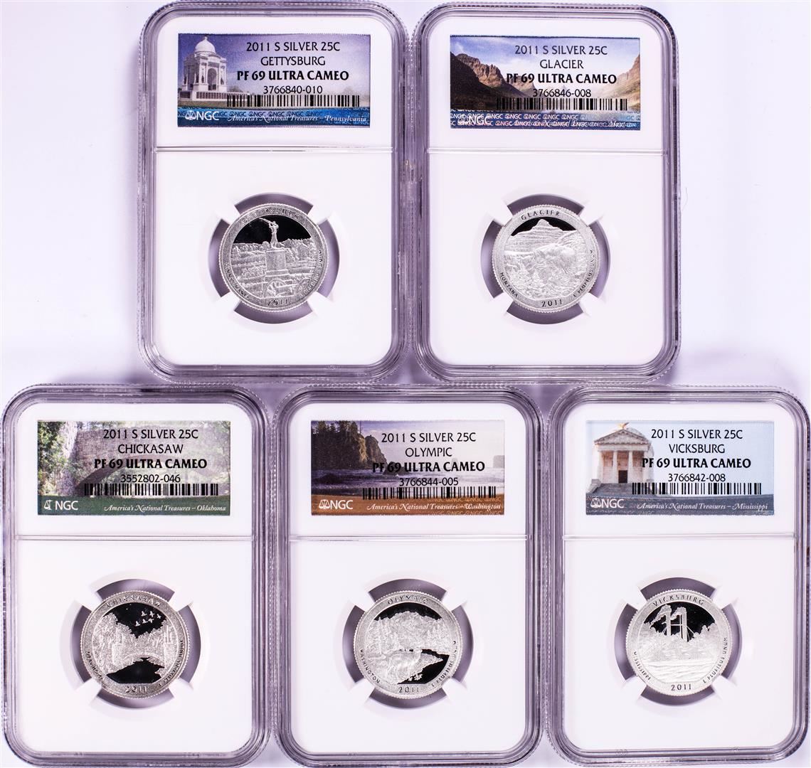 One 2011-S Silver Proof National Parks Quarter (5) Coin Set NGC PF69 Ultra Cameo.