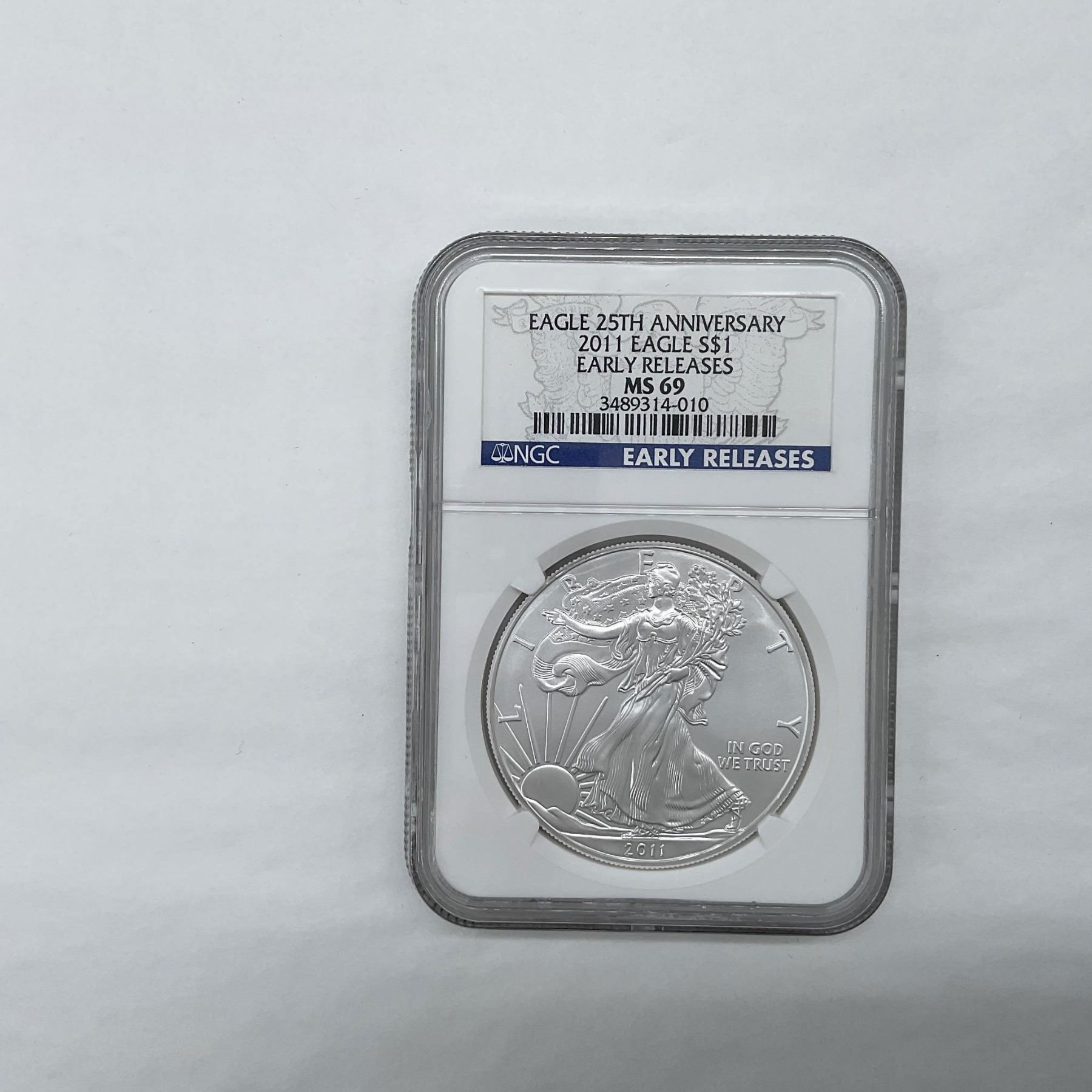 25th Anniversary. Early Releases. The obverse side depicts Liberty in full stride. She is shown wrapped in the flag, her right hand is extended and her left arm is carrying laurel and oak branches. The reverse side features the heraldic eagle clutching an olive branch and arrows. The coin is in a protective case. The case is approximately: 2.25"L x 0.5"W x 3.25"H.