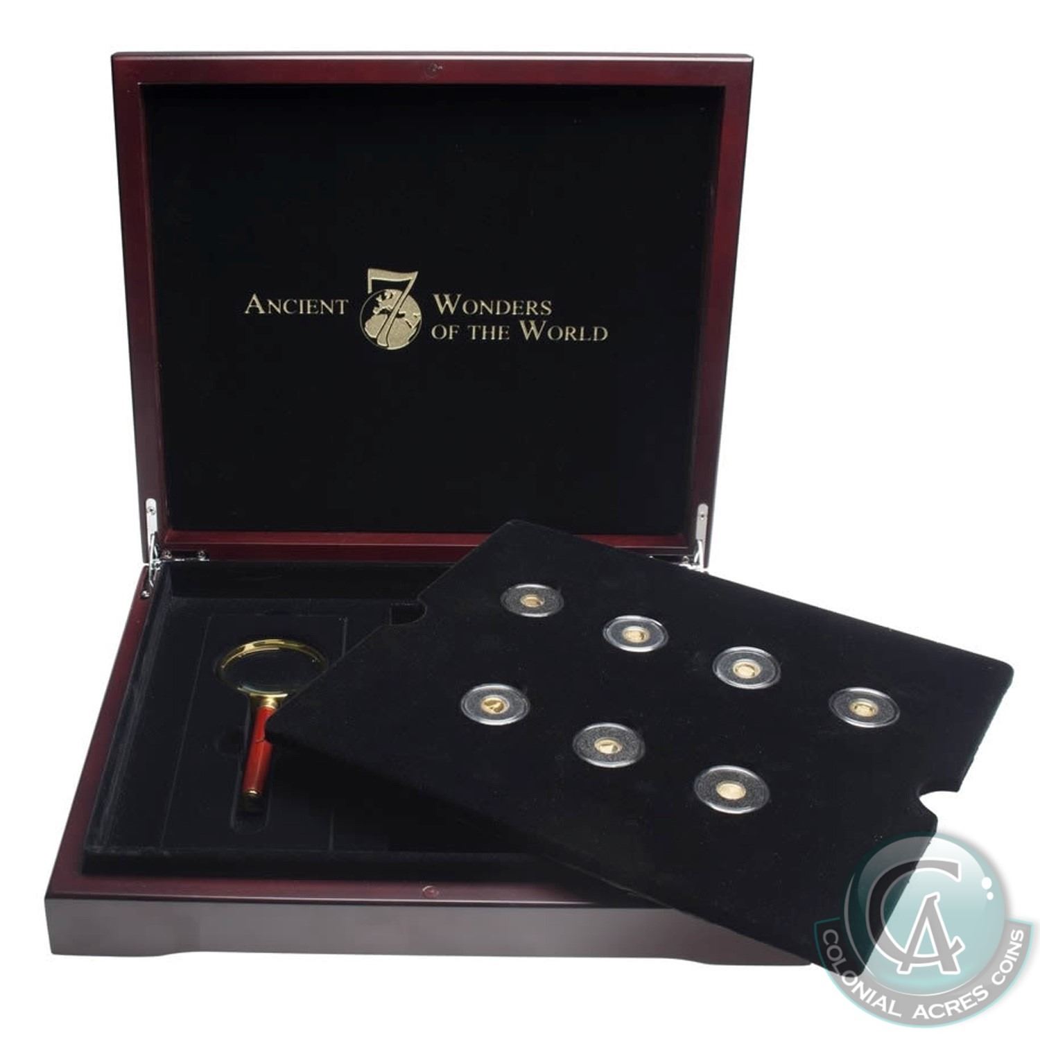 2011 Solomon Islands 7-coin Wonders of the Ancient world old coin Collection with deluxe wooden display case. Included in this set is a Magnifier, Certificate of Authenticity and Seven Small Gold coins each depicting the 7 Wonders of the Ancient World: Pyramid of Giza, Babylon Garden, Temple of Artemis, Mausoleum at Halicamassus, Colossus at Rhodes, The Lighthouse of Alexandria and The Statue of Zeus. Weight of each coin is 0.5 grams and contains .585 and 24K Gold plating.