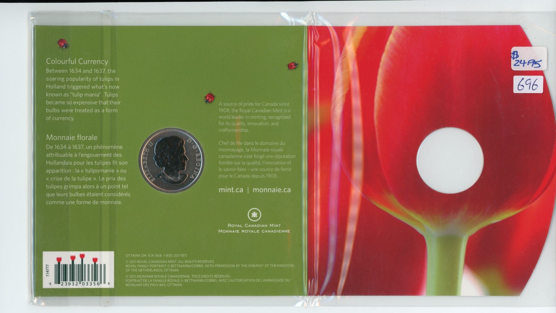 2011 Tulip with Ladybug 25 Cents. Specimen. A beautiful coin housed in its original unopened Royal Canadian Mint folder.