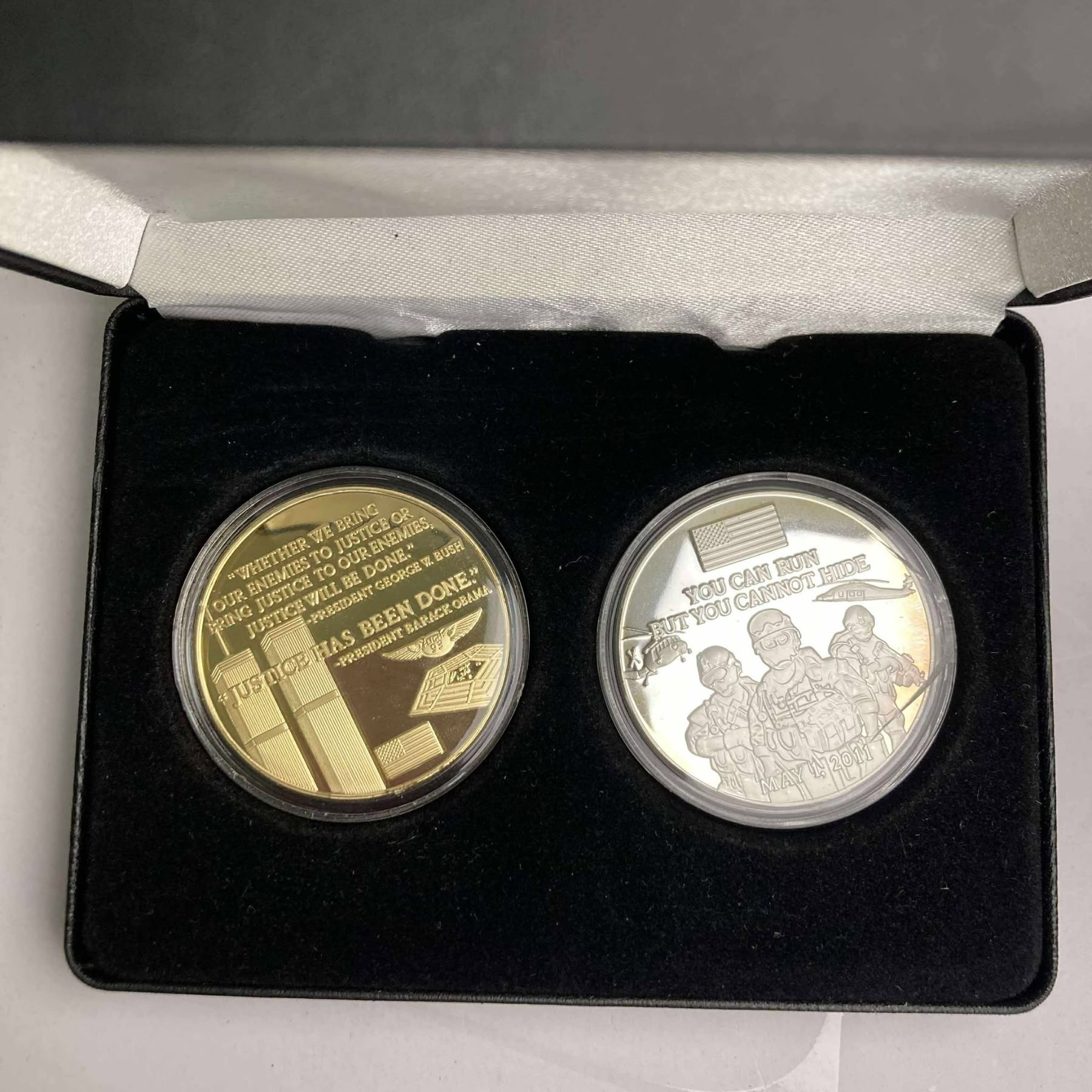 You can run but you cannot hide. Justice has been done. Brass and silver plated medals in case. One capsule is cracked.