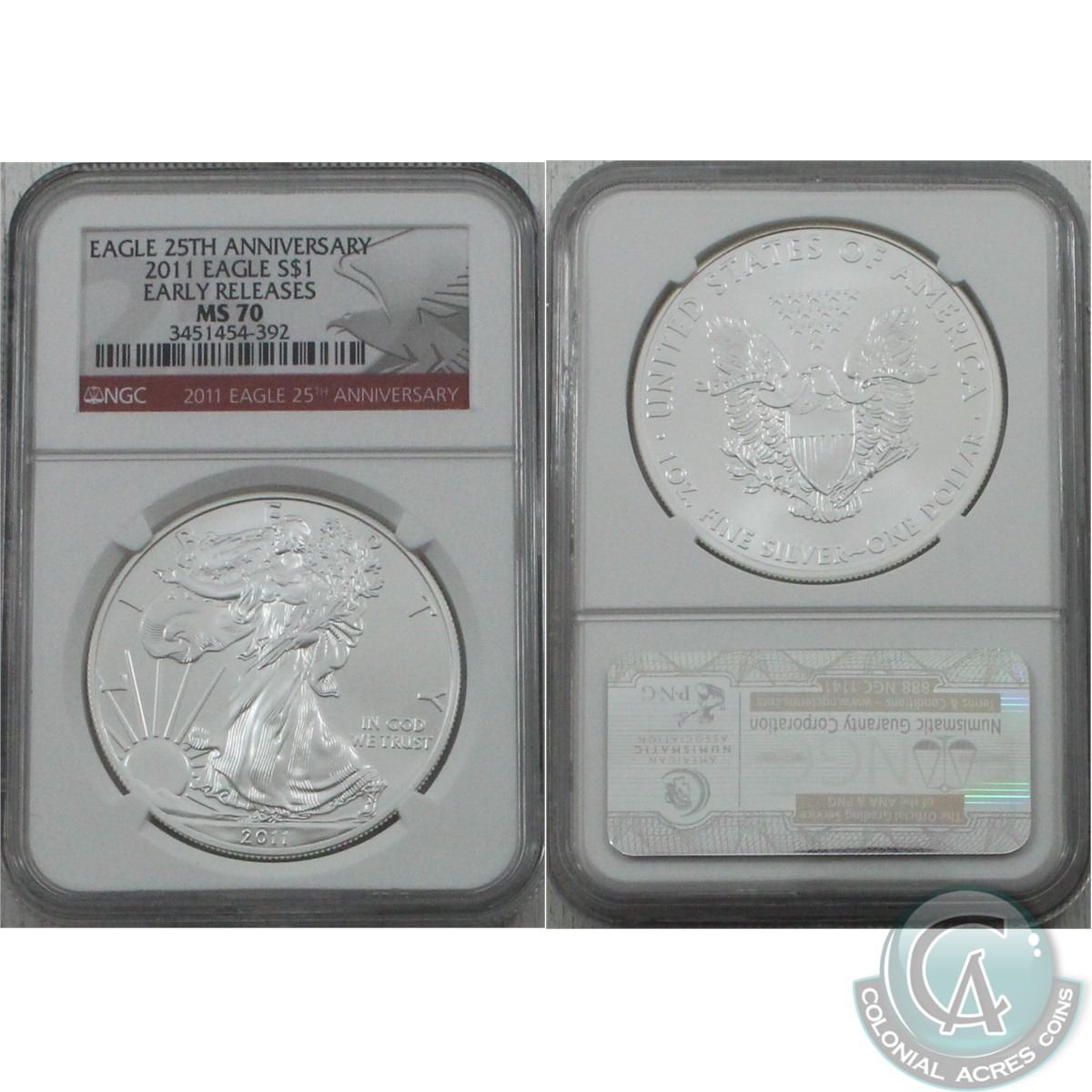 2011 United States $1 Silver Eagle 25th Anniversary 1oz Fine Silver NGC Certified MS-70 (TAX Exempt)
