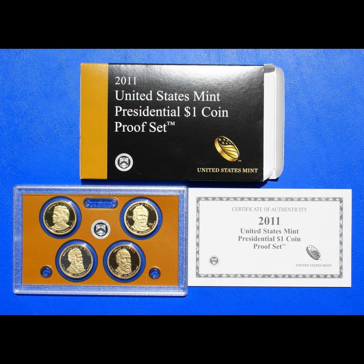 2011 United States Mint Presidential $1 Coin Proof Set . .. This set contains the 4 Presidential Dollars Issued for 2011, Including; US Grant, James Garfield, Rutherford Hayes, and Andrew Johnson. Complete in Original Packaging with COA. Estimated Value $20