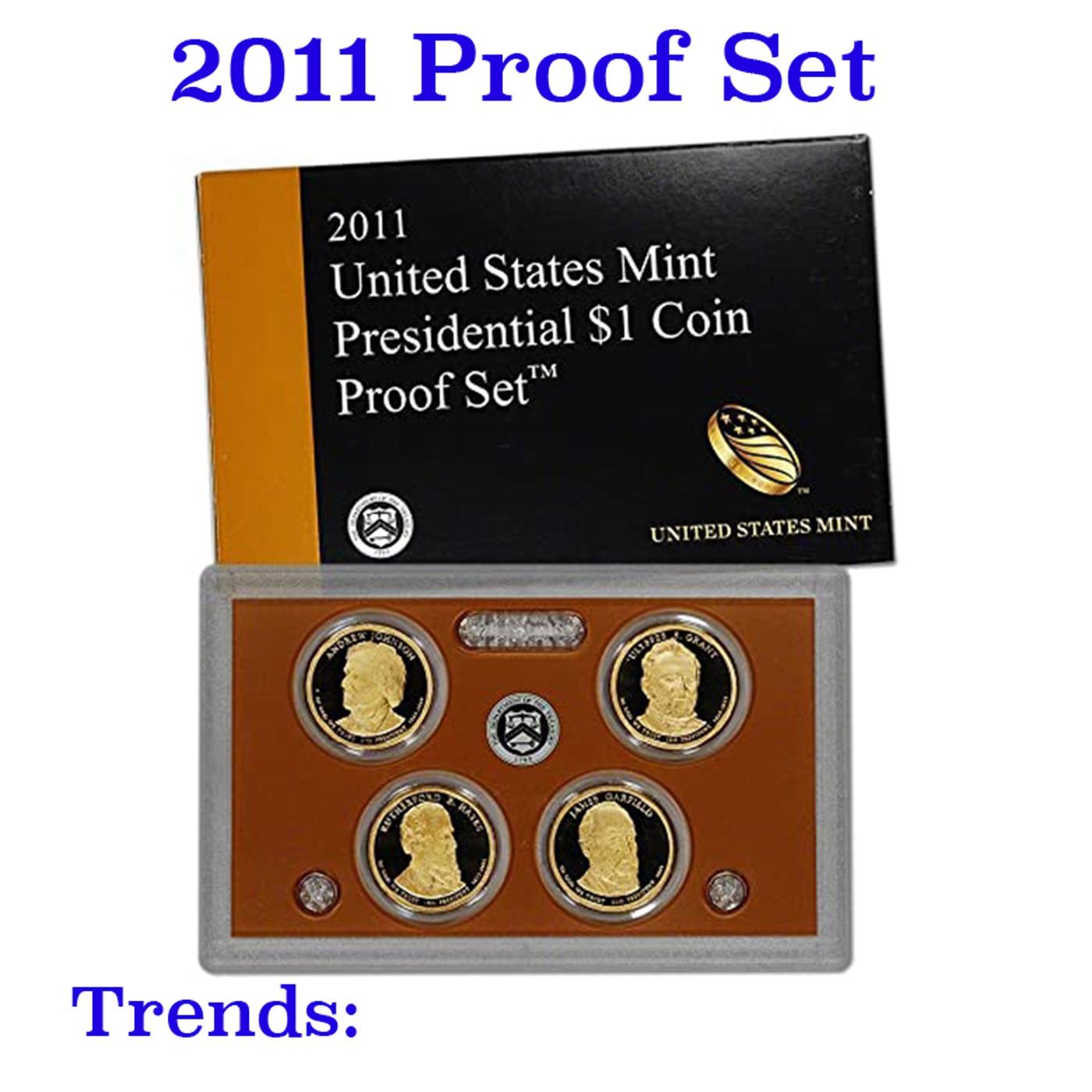 2011 United States Mint Presidential Dollar Proof Set - 4 pc set. This set contains the 4 Presidential Dollars Issued for 2011, Including; US Grant, James Garfield, Rutherford Hayes, and Andrew Johnson. Complete in Original Packaging with COA.
