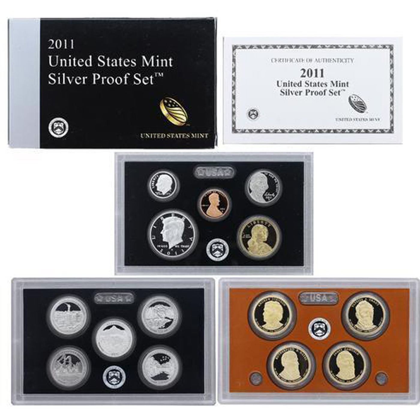 2011 United States Mint Proof Set - 14 pc set. The Set contains 5 Proof Quarters, a Proof Kennedy Half Dollar, 4 Proof Presidential Dollars, as well as 4 additional Proof coins Including the Sacagawea Proof Dollar coin. Complete with Original Packaging and COA.