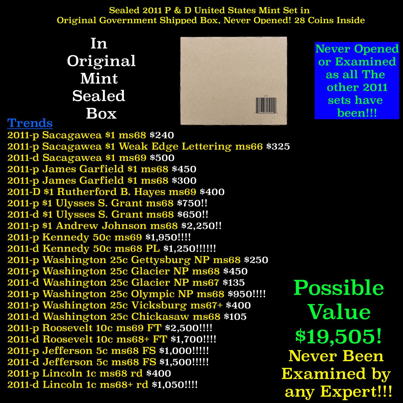 2011 United States Mint Set in Original Government Packaging! 28 Coins Inside!. After six years of utilizing a special satin finish for the annual mint set, the United States Mint switched to using a brilliant finish for coins included within the 2011 Mint Set. According to the Mint, the reason for the change was to create more aesthetically pleasing coins, as the previous finish made contact marks from coin on coin contact more apparent. The new brilliant finish was produced by striking coins on special presses using greater than typical force to create an intricately detailed image. Despite higher strike quality and more lustrous surfaces, the coins are typically not differentiated as separate issues from standard circulation strikes.A total of 28 different coins were included in the set. The historically high number of coins in the set was the result of the multiple designs issued under the America the Beautiful Quarters and the Presidential Dollars Programs. Each set included the following coins: P&D Lincoln Cents. P&D Jefferson Nickels. P&D Roosevelt Dimes. P&D America the Beautiful Quarters (Gettysburg, Glacier, Olympic, Vicksburg, Chickasaw). P&D Kennedy Half Dollars. P&D Presidential Dollars (Andrew Johnson, Ulysses S. Grant, Rutherford B. Hayes, James Garfield). P&D Native American Dollars. The design for the packaging was updated to match the new brand identity and logo adopted by the United States Mint. The logo consists of a golden colored coin flipping through the air against a black background.
