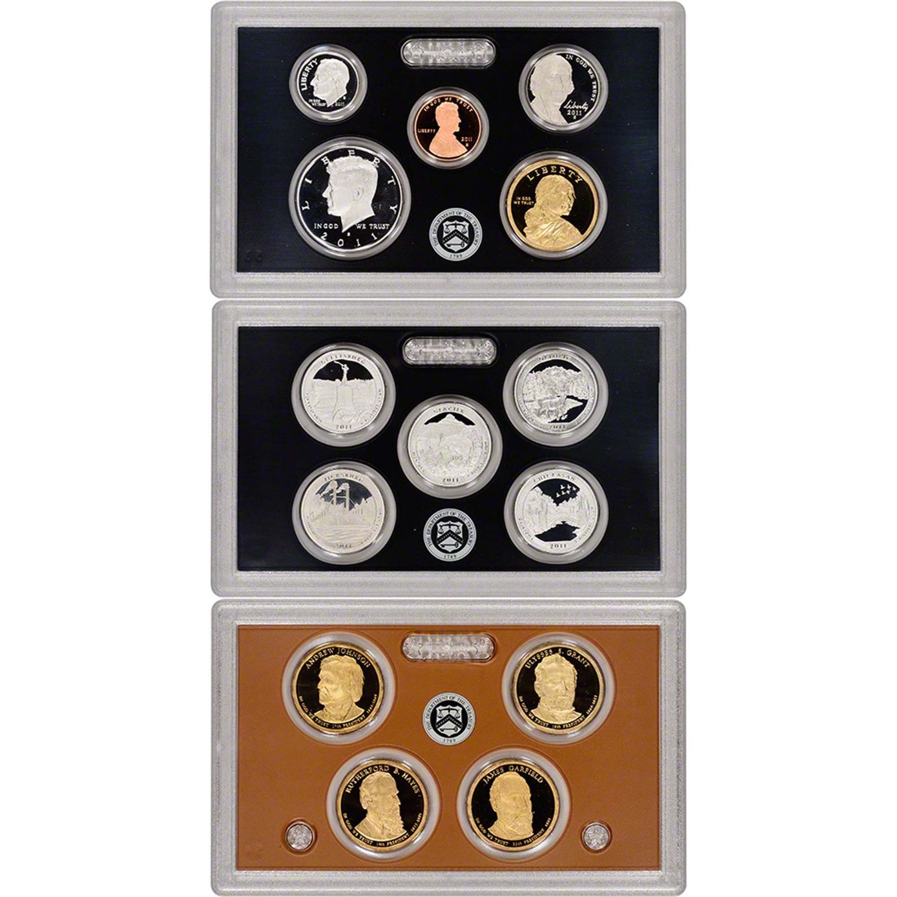 2011 United States Mint Silver Proof Set - 14 pc set, about 1 1/2 ounces of pure silver . .. The Set contains 5 90% Silver Proof Quarters, a 90% Silver Proof Half Dollar, a 90% Silver Proof Dime, 4 Proof Presidential Dollars, as well as 3 additional Proof coins Including the Sacagawea Proof Dollar coin. Complete with Original Packaging and COA. Note* The set contains over 1.4 Ounces of Pure Silver.