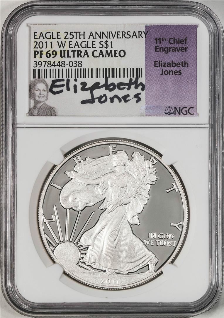 One 2011-W $1 Proof American Silver Eagle Coin NGC PF69 Ultra Cameo Elizabeth Jones Signature. NGC Certified.