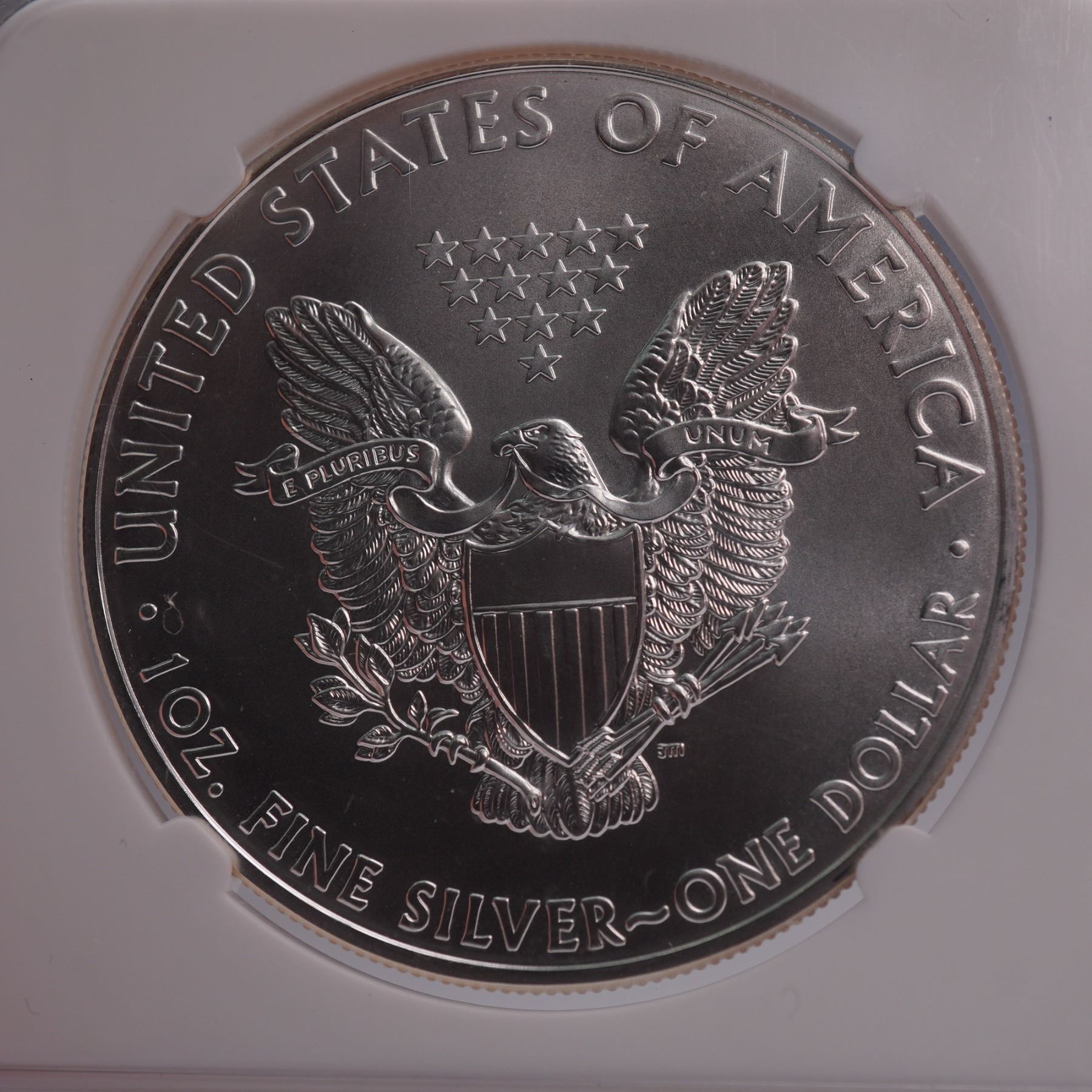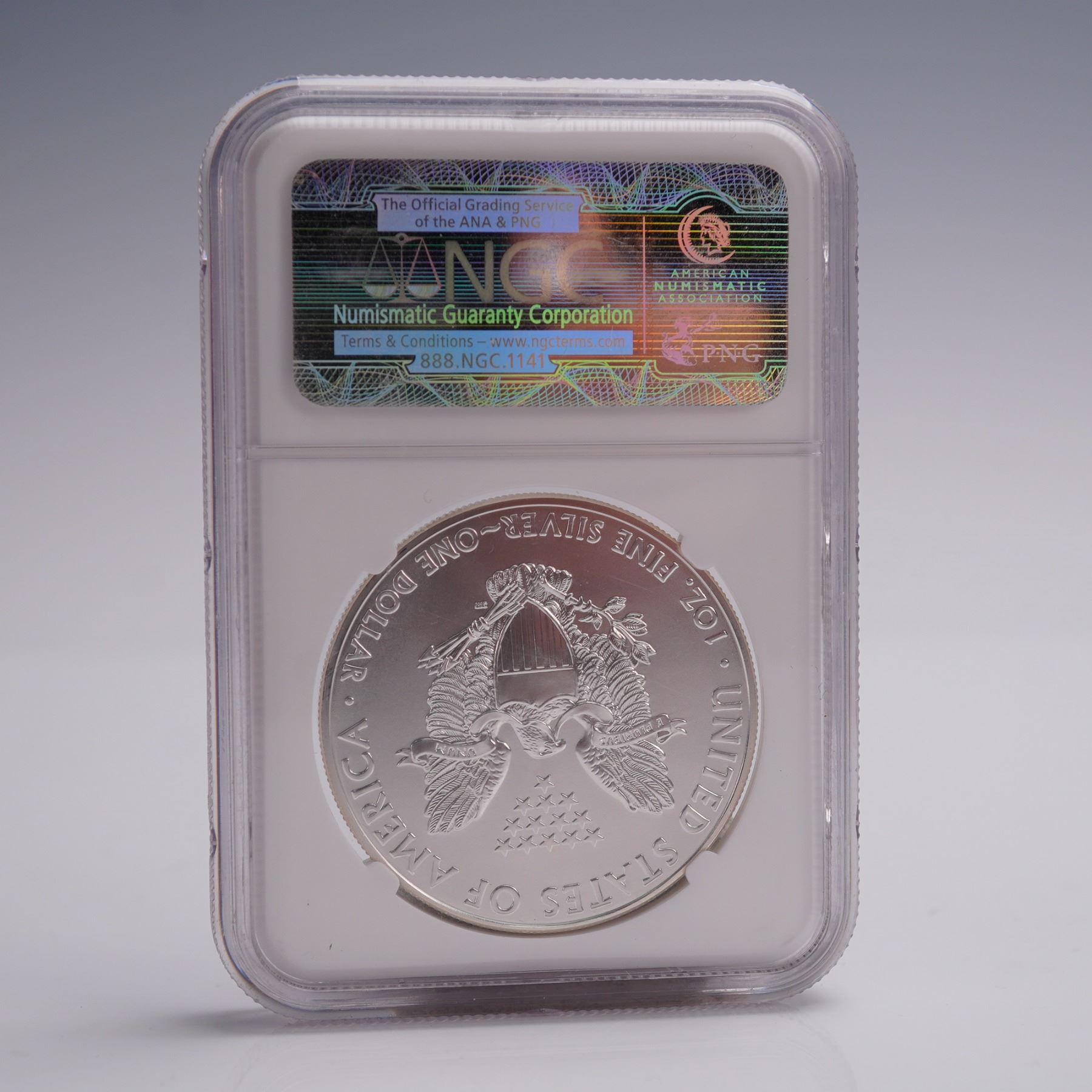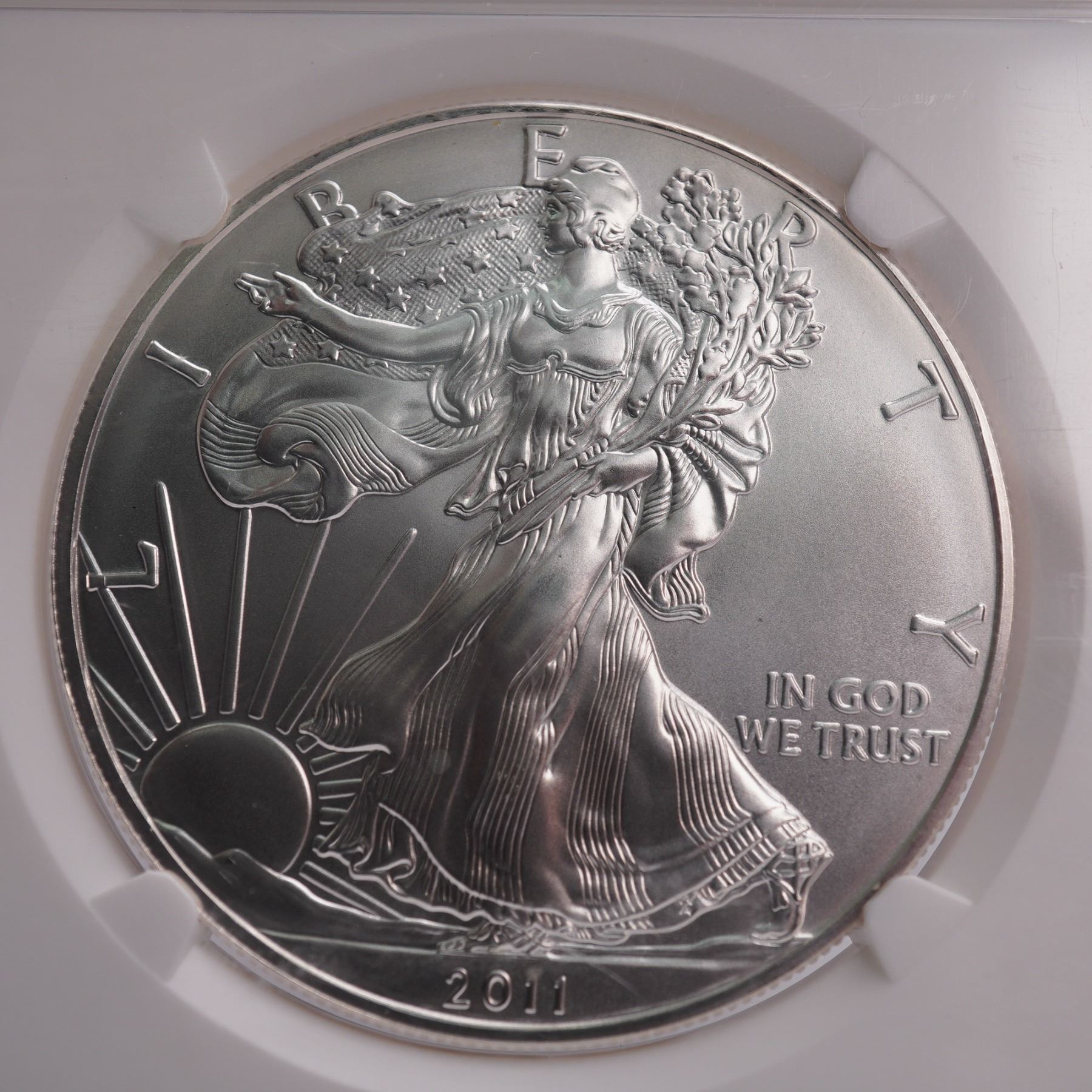 An intricately struck 2011 American Silver Eagle one-ounce bullion coin bearing the "W" mintmark of the West Point Mint, designated as an Early Release by NGC and awarded a nearly pristine MS69 grade. Struck in .999 fine silver. The obverse features Walking Liberty design, radiating with precision and dimensionality, with the allegorical figure draped in the stars and stripes advancing toward a rising sun. The face, inscribed with LIBERTY, IN GOD WE TRUST, and the year 2011. The reverse showcases a resolute national symbol clutching arrows and olive branch beneath a triangular constellation of thirteen stars. Surrounded by UNITED STATES OF AMERICA, 1 OZ. FINE SILVER - ONE DOLLAR. Housed in a graded NGC slab for further preservation and authentication. Slab measures: 2.25"L x 0.25"W x 3.25"H. Coin diameter: 40.6 mm.